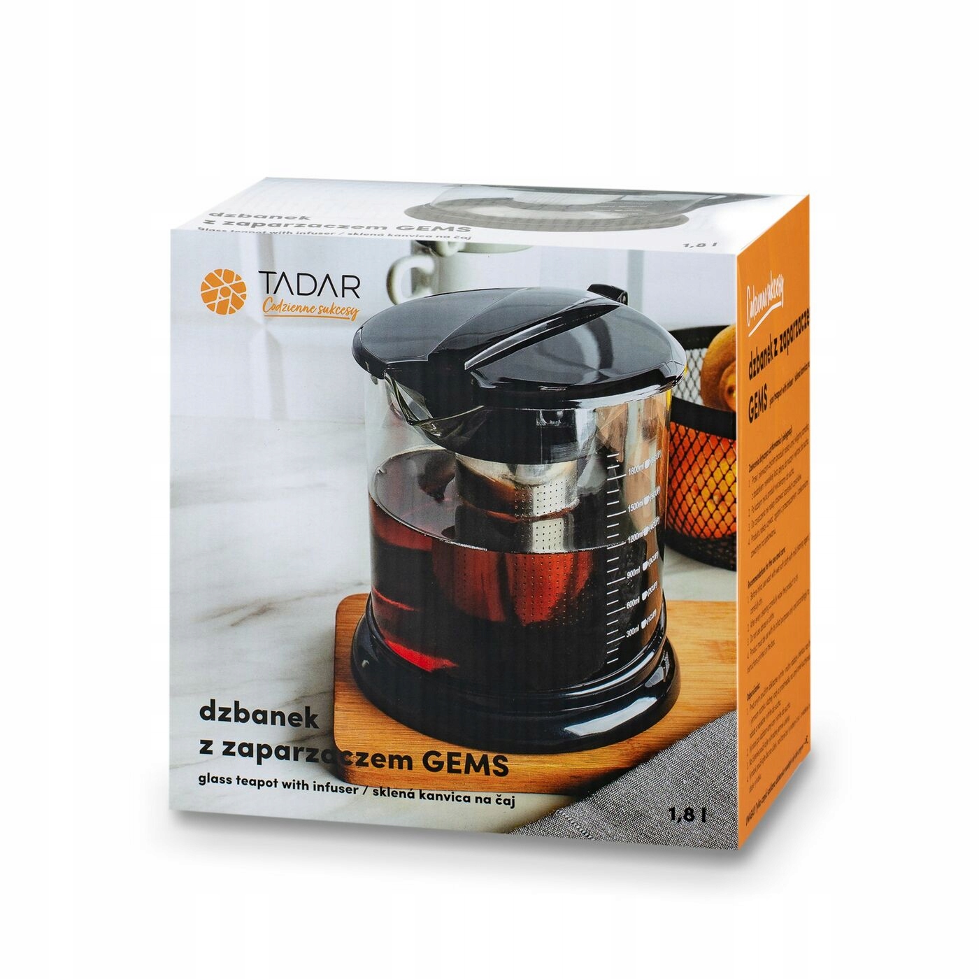 Чайник Tadar Gems 1,8 л із заваркою — це практична ємність для вашого улюбленого чаю чи трав. Його велика зручна ергономічна ручка полегшує наливання напою. Аналогічно профільованому виливу, який додатково запобігає проливанню. Заварка з нержавіючої сталі з невеликими отворами забезпечує кристально чистий напій без гущі. Виріб виготовлено з міцного та легкого скла. Тому цей класичний глечик прослужить у вашому домі дуже довго. Натрієве скло характеризується високою міцністю. Можна сміливо вливати в нього окріп. Його не пошкодить термічний удар до 100 градусів за Цельсієм, він також стійкий до подряпин, тому довго залишатиметься кристалічним. Ви можете рухати глечик і використовувати його, не боячись обпекти руки. Використовуючи сталевий заварник для листя м’яти, скибочок лимона та заморожених фруктів, ви також можете створювати прохолодні напої для літа.