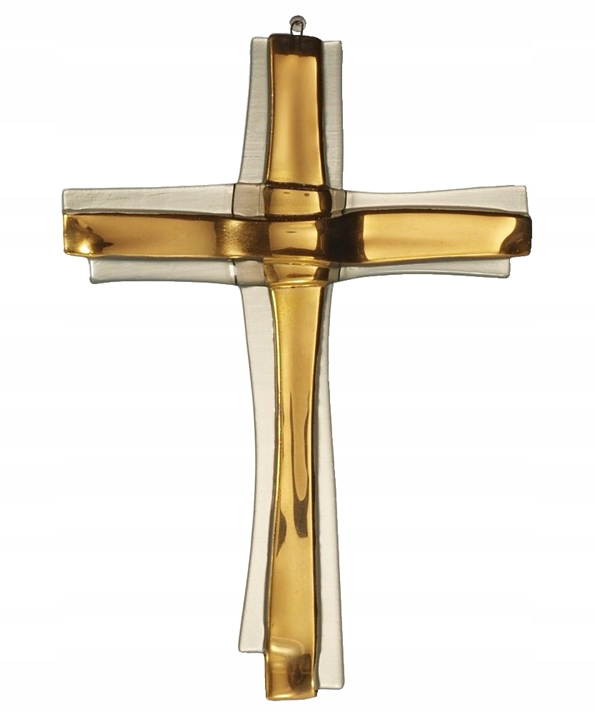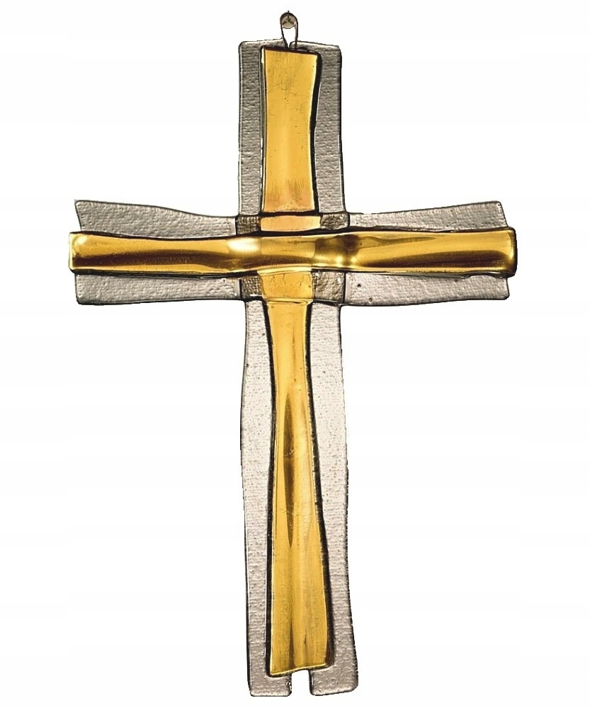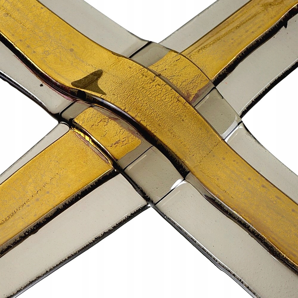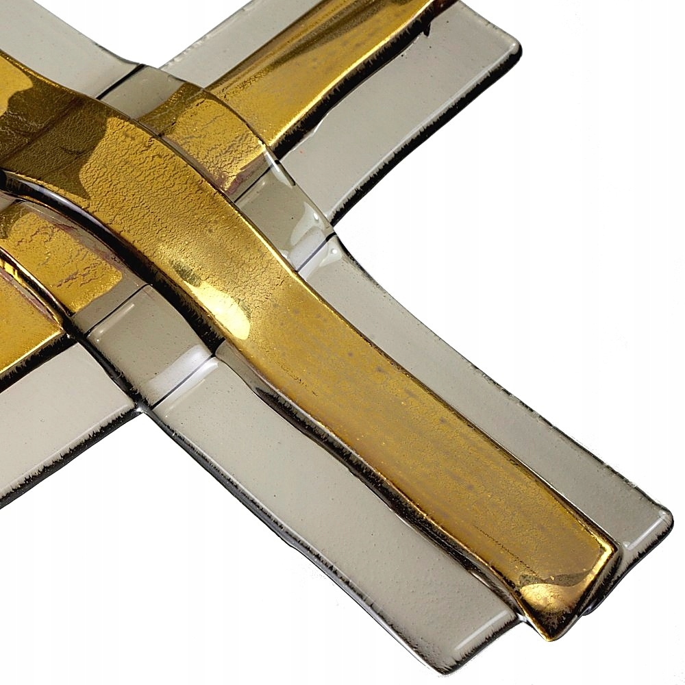 Ця розкішна стіна на стіні виготовлена з прозорого димового скла і має цікавий, шаруватим виглядом. Центральна частина хреста позолочена справжнім золотом. Позолочення виготовляється за допомогою техніки Краків, а це означає, що золото трохи розтріскується. Хрест набуває стародавнього вигляду.