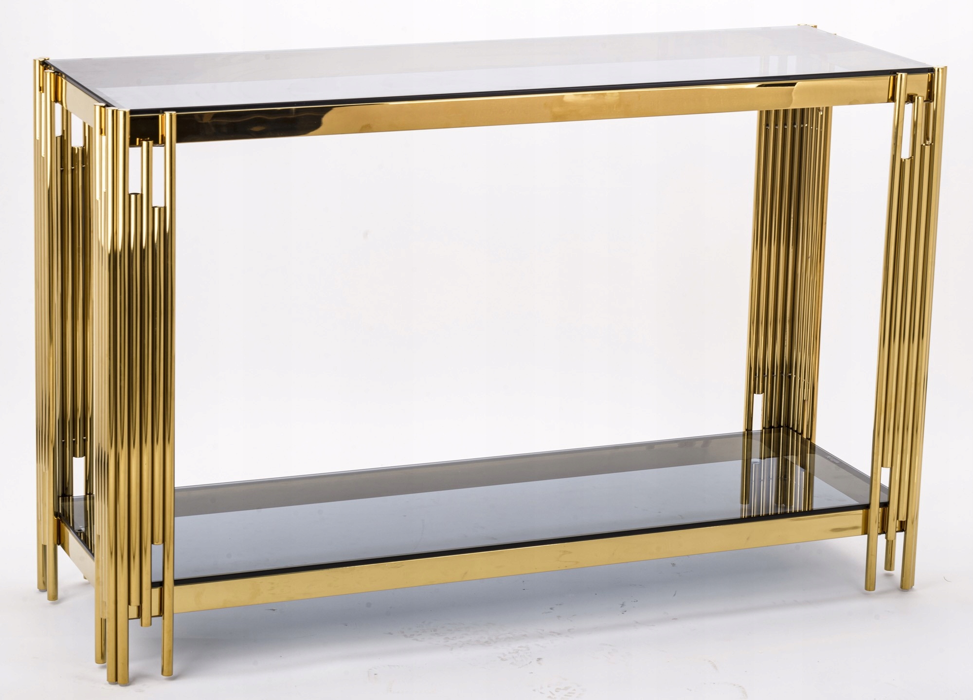Консоль призначена для прикраси вітальні, холу або холу. Він також добре працюватиме в салонах краси, спа та перукарнях. Основа складається з металевих ніжок золотистого кольору зі скляною верхньою частиною в поєднанні з полицею Гарний подарунок собі або близькій людині, як оригінальний, дуже виразний декоративний аксесуар. Столи найкраще впишуться в інтер’єри, оформлені в сучасному, змішаному або гламурному стилі.