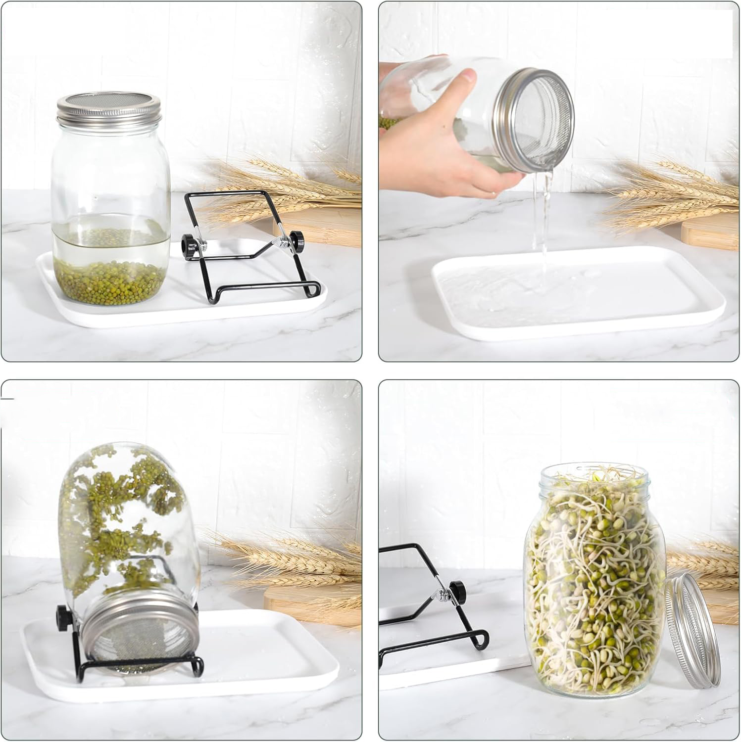 🌱 【Регульована стійка】 Кут нахилу підставки може бути вільно відрегульований, щоб насіння різних розмірів може прилипати до банки. Це добре для вентиляції та дренажу води і робить смачні паростки квасолі залишатися свіжими, чистими та гігієнічними.