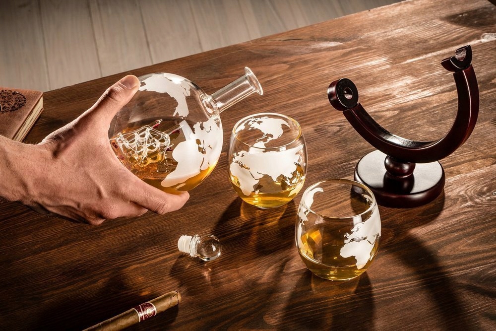 - стильний гравірований графин глобус із красивим вітрильником усередині та двома склянками