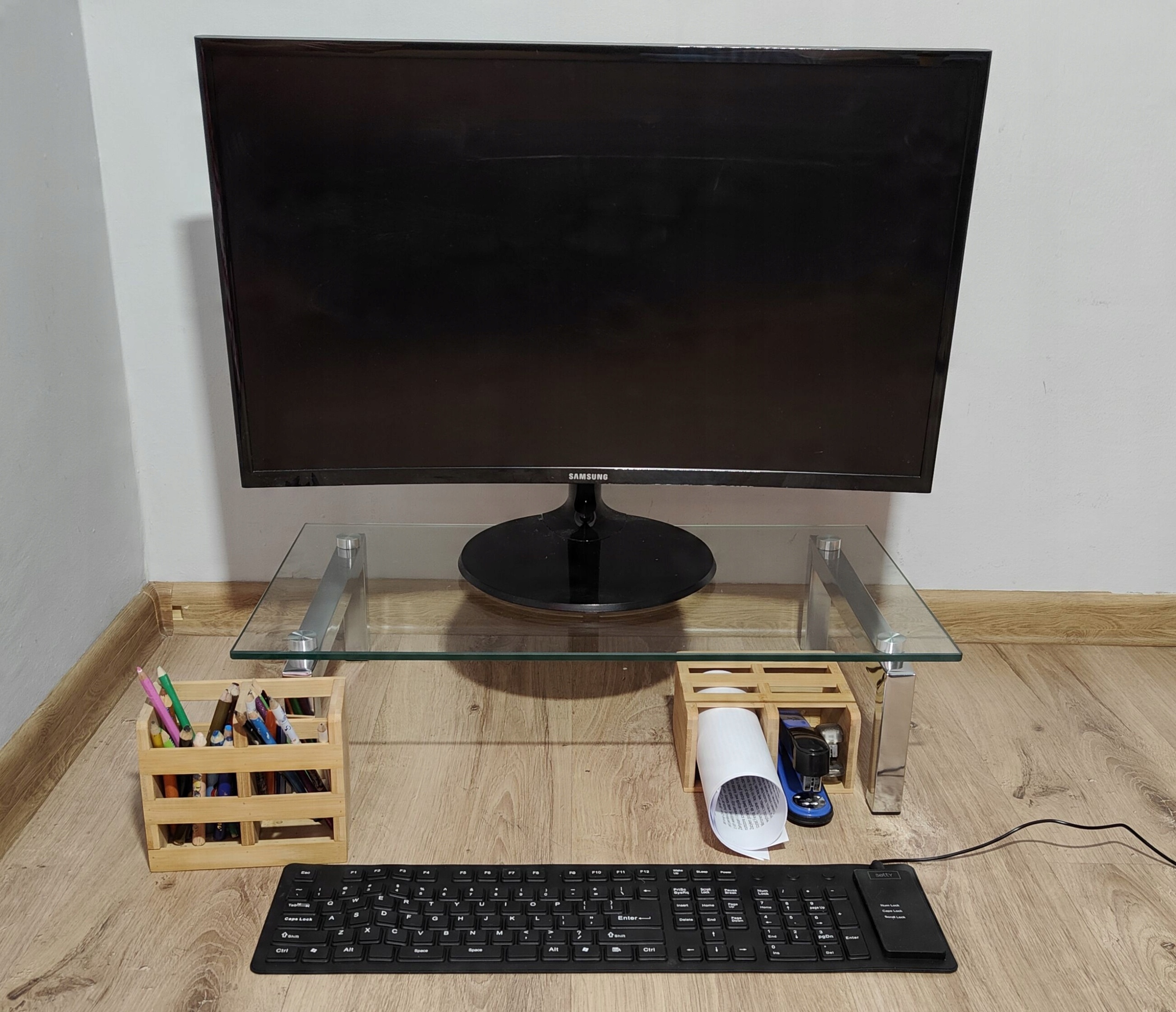 Скляний стіл для сніданку, ліжко, монітор, ноутбук