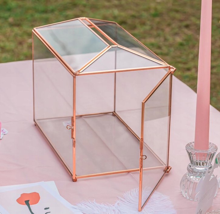 Коробка для карток з геометричним рожевим золотом скла з отвором і замком для весільного прийому, ручна робота 26 x 15 x 20,3 см, прозорий тримач для карток, великий тераріумний кашпо,