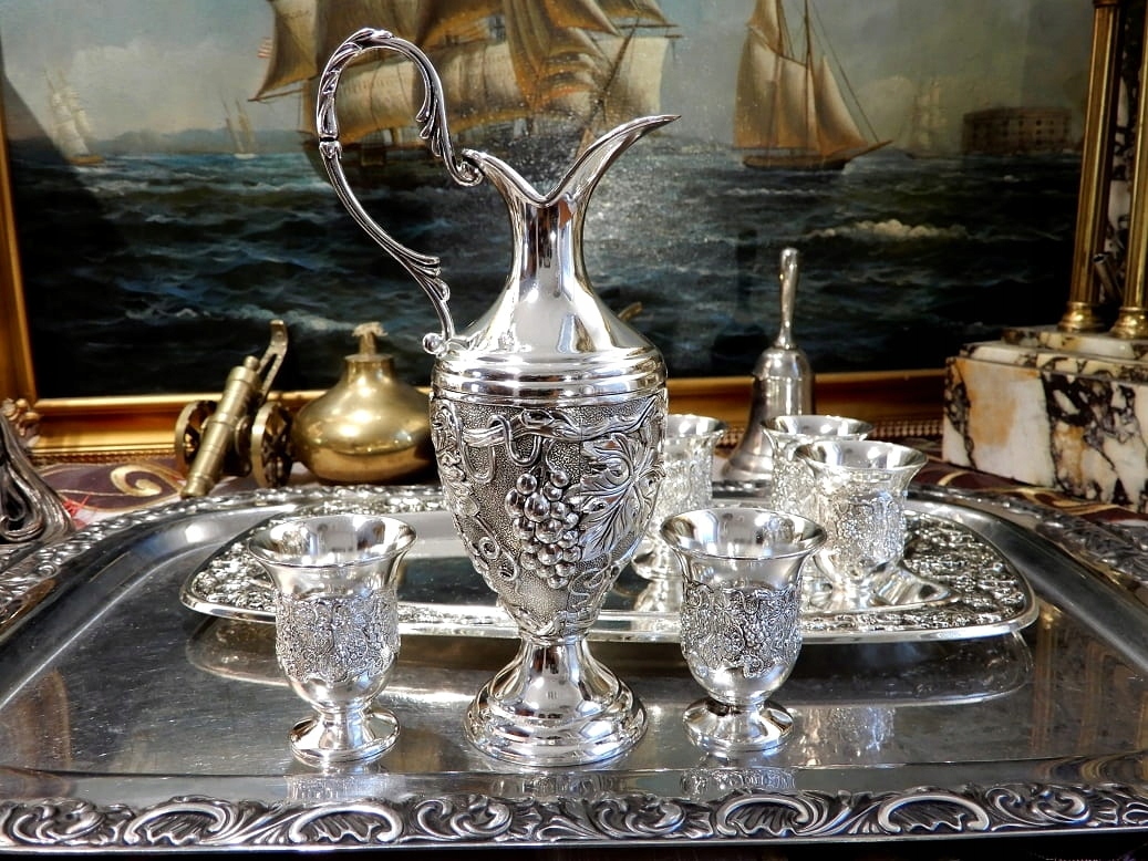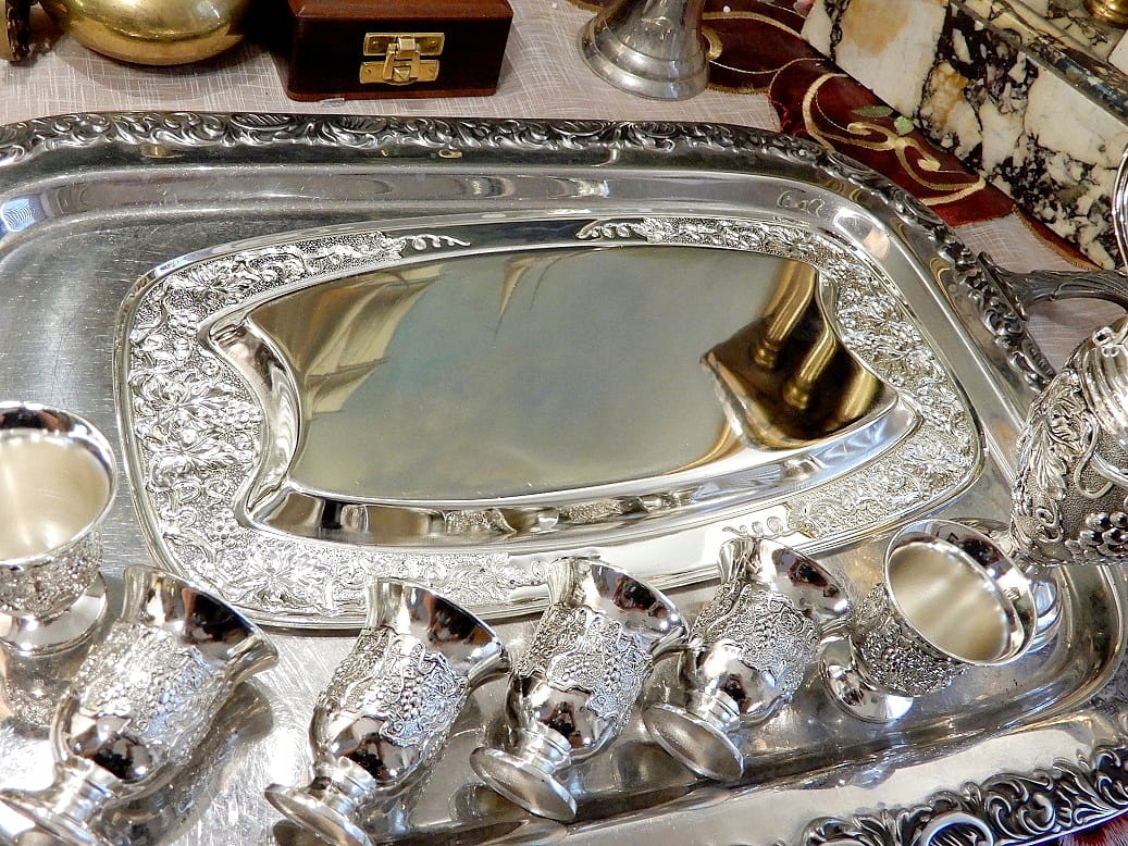 Все виготовлено з металу (литий цинковий сплав), покритий шаром срібла (ПЛАСТИНА), піднос виготовлений із сталевого листа, покритого міддю, а потім сріблом, він жорсткий і твердий.