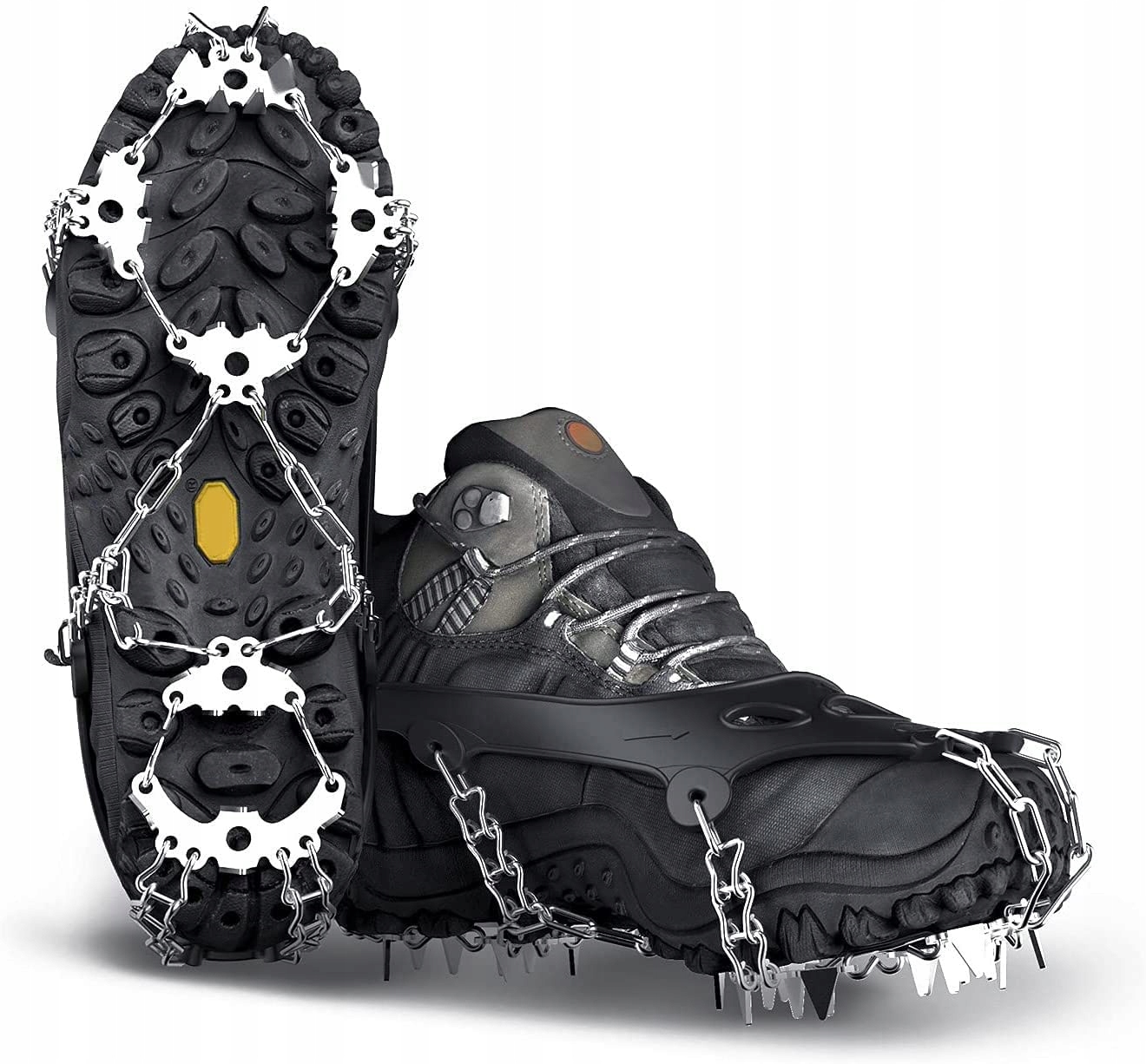 ✅ Посилені скоби з нержавіючої сталі з системою подвійного ланцюга з 24 зубцями можна надійно прикріпити до всіх черевиків. Ці ланцюги протиковзання не іржавіють і підходять для льоду, снігу та слизьких умов.