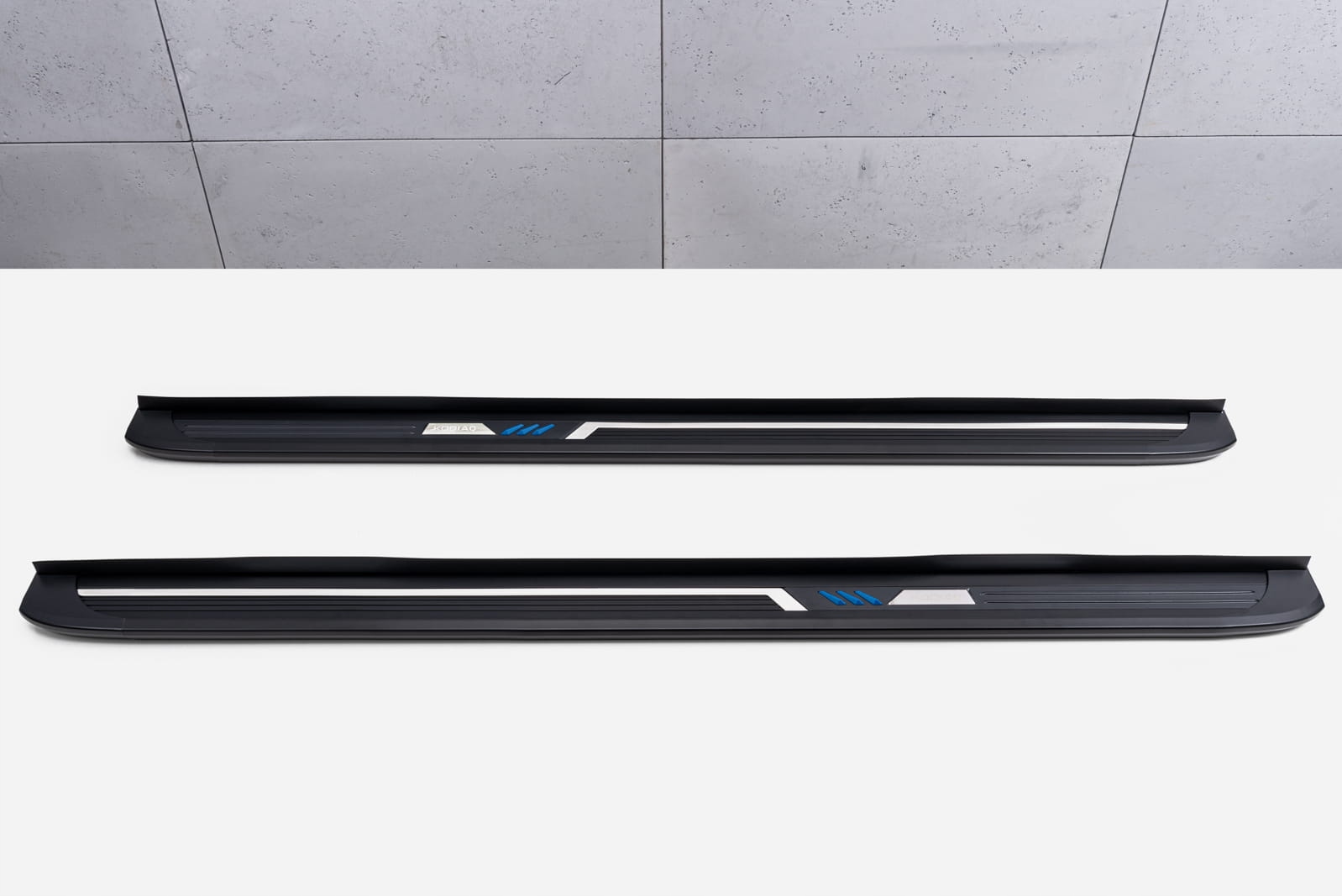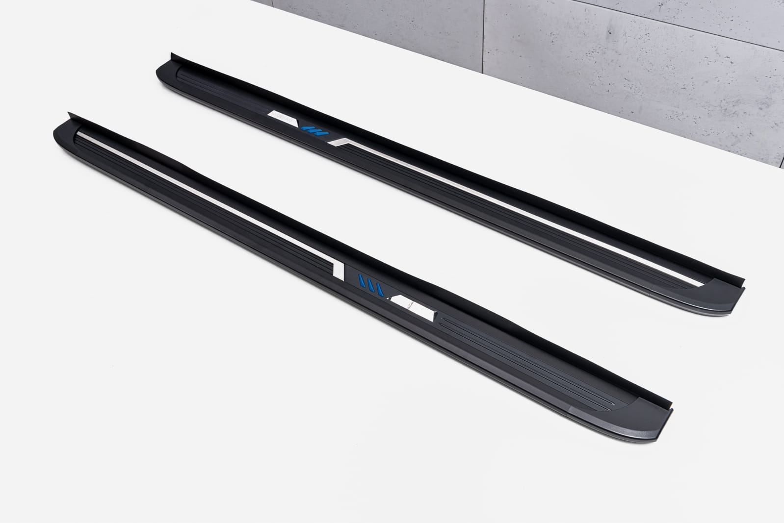 Представляємо набір порогів, які відрізняються оригінальним сучасним дизайном. Пороги розроблені відповідно до сучасних тенденцій, тому вони не тільки підвищують комфорт подорожуючих, але й є справжньою окрасою автомобіля. Декоративні сталеві елементи додають престижний акцент на порогах, а також відсилають до інших елементів кузова вашого автомобіля - все це означає, що пороги ідеально доповнюють стиль автомобіля, підкреслюючи його спортивну душу та індивідуальний характер.
