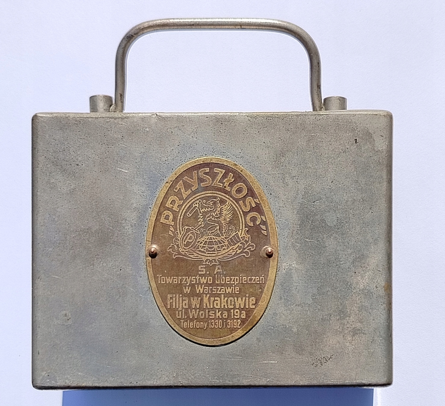 Скарбничка "PRZYSZŁOŚCI" S.A. Страхова компанія у Варшаві Відділ у Кракові вул. Вольська 19а (мідний знак, прикріплений до кубоподібної конструкції мідними заклепками). У верхній частині є ручка, також отвір (мабуть не для вимірювання вмісту), внизу дверцята з замком (замка нажаль немає). Кубовид розмірами 10,5х8х6 см, виготовлений з латуні, нікельований. Хороший стан [ незначне пошкодження гальванічного покриття біля дверцят внизу, ймовірно раніше забитий отвір, спочатку зроблений у верхній частині ][ СКОРИНКА ] [ Друга Польська Республіка ] [ КОНСУЛЬТАЦІЯ ][ ЕКОНОМИЯ ][ СТРАХОВКА ] 309E