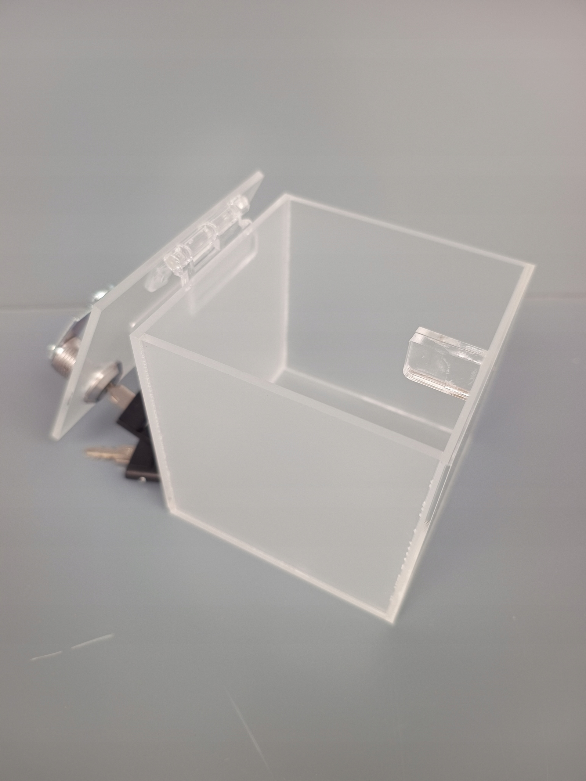 Предметом аукціону є скарбничка з прозорого оргскла молочного кольору (ПММА - поліметилметактилат) з товщиною стінок 3 мм і розмірами (ширина, глибина і висота):