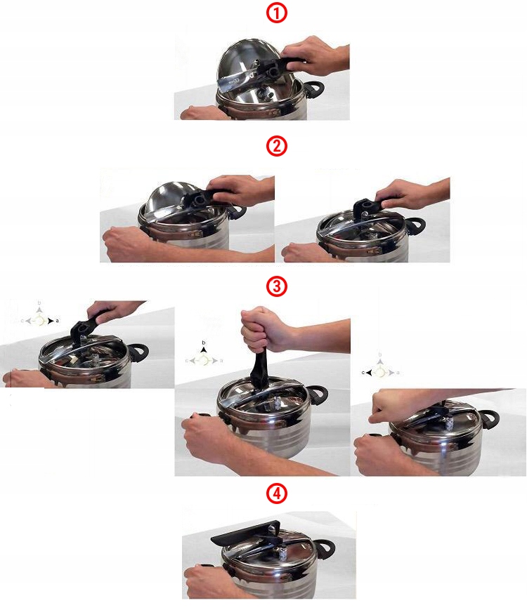 Скороварка закрита зсередини, тобто кришка скороварки вставляється всередину під кутом 45 градусів. Потім верхня балка фіксується на краях каструль і щільно закривається, переміщаючи важіль/ручку в протилежному напрямку. На заводі всередині скороварки встановлено ущільнювач, який запобігає виходу пари.
