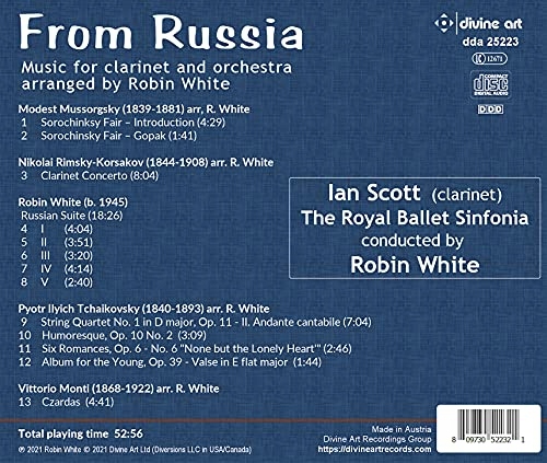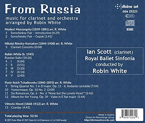 Чиста евтеляція забезпечується цією чудовою новою записом популярної російської музики, організованою для кларнета та оркестру від Робіна Уайта. З концерту кларнету Рімського-Корсакова забив за військовим гуртом до Анданте Кантабіла з першого струнного квартету Чайковського (основне для аранжувальників десятиліттями) це прекрасно відтворений альбом одного найсобаднішого оркестру британської. Інтерлопер (але вітальний) з Італії (але східноєвропейського стилю) забезпечує чудовий фінал. Ян Скотт - головний кларнет Королівського балету Сінфонія і був гостьовим директором з Saveral Top London Orchestras. Раніше він робив прем'єрні записи Clarinet Concertos для ASV та Dutton. Домовлювач та диригент Робін Уайт користувався дуже напруженою та різноманітною кар'єрою; Його перший запис (1992, Чандос) був дуже популярним, і він зробив інші записи про легку музику для кількох лейблів. Він керував власним оркестром та хором і з’явився зі своїм хором у ключовому епізоді британського телевізійного серіалу EastEnders. Як аранжувальник легкої музики, його твори багато разів транслювали BBC Orchestras.