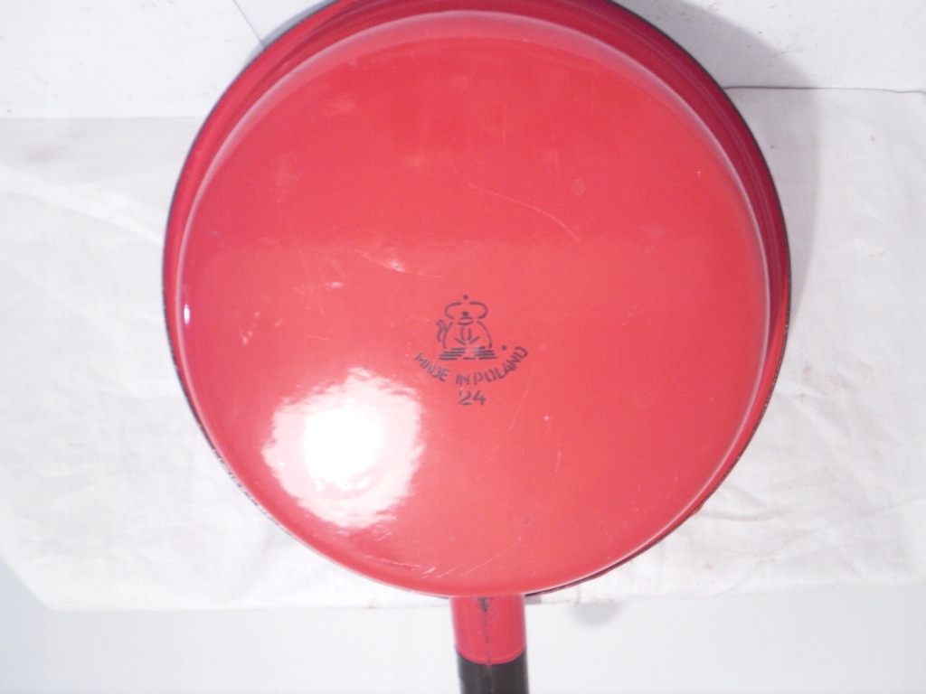 Ласкаво просимо на мій аукціон. На аукціонах я зазвичай пропоную вам речі періоду Польської Народної Республіки. На даному аукціоні пропоную ОРИГІНАЛЬНУ і гарну емальовану сковорідку з ПНР. Сковорода в дуже хорошому стані, невелика зміна кольору, мікроподряпини, єдині вм'ятини на емалі - кілька маленьких і одна на краю при кріпленні ручки. Дивлячись на каструлю, вона виглядає як НОВА, біла внутрішня частина виглядає так, ніби нею ніколи не користувалися, решта каструлі червона з чорною ручкою/ручкою та чорним обідком. Каструля має чіткий і розбірливий підпис на дні. Гарна окраса нашого житла. Зрозуміло, очищений і вимитий, нічим не змащений. РІДКІСТЬ в такому гарному стані. /див. фото/.