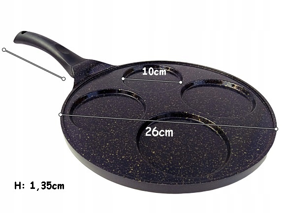 Інша інформація: - сковорода з литого алюмінію, - покрита антипригарним мармуровим покриттям, - не містить PFOA, - Бакелітова ручка з отвором для підвішування, - висота краю каструлі: 1,5 см, - діаметр окремого отвору: 10 см, висота краю: 0,5 см.