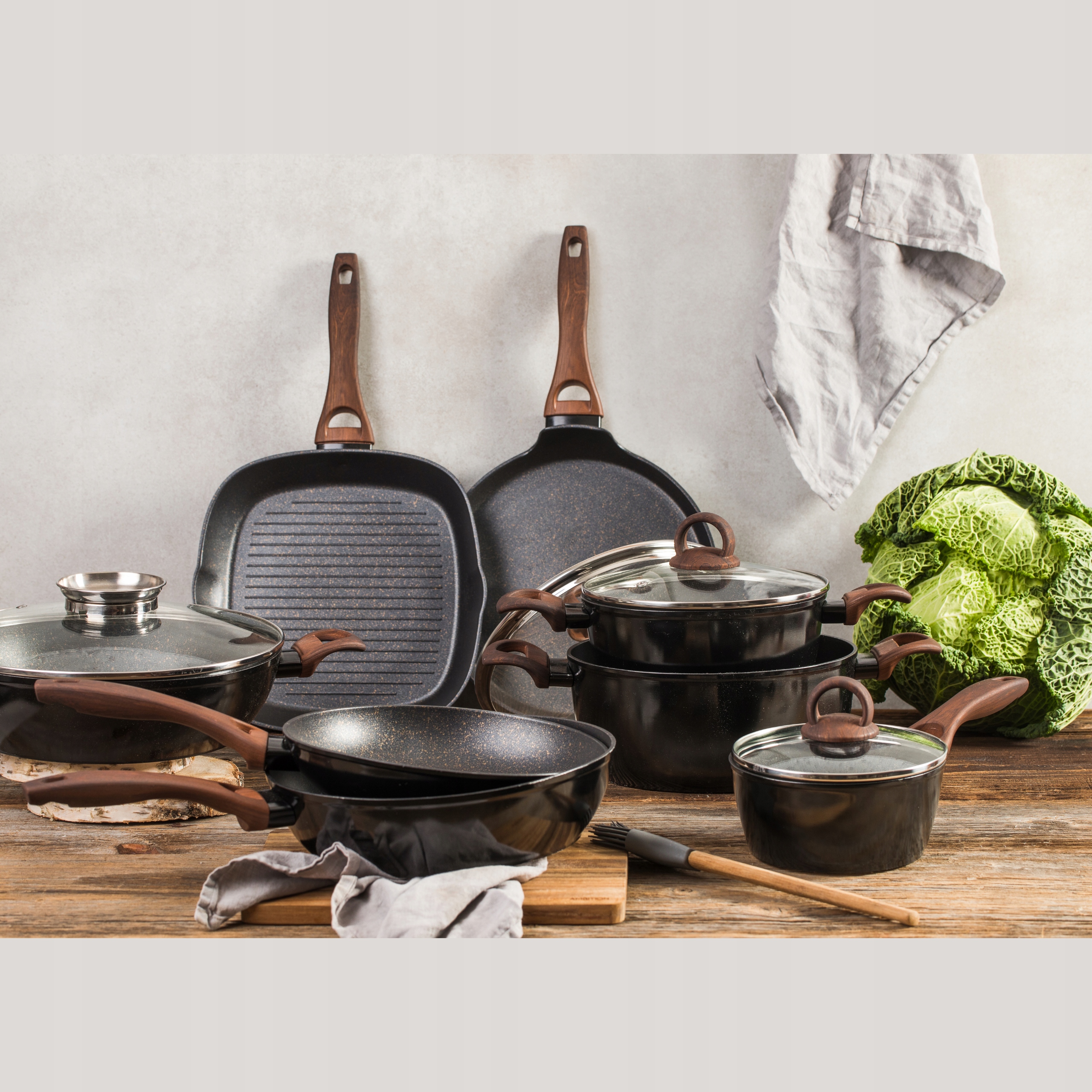 ✅ Лінія DARKWOOD - це унікальний посуд з кованого алюмінію, стійкого до деформації. Внутрішня частина виробів покрита оригінальним антипригарним покриттям Qualum Basic Stone Edition імітує камінь. Qualum Basic Stone Edition — це покриття з дуже хорошими антипригарними властивостями та дуже хорошою стійкістю до стирання. Ручки покриті спеціальним матеріалом Soft Touch, що забезпечує міцне захоплення в руці. Продукти лінії DARKWOOD підходять для використання на всіх типах плит, включаючи індукційні.
