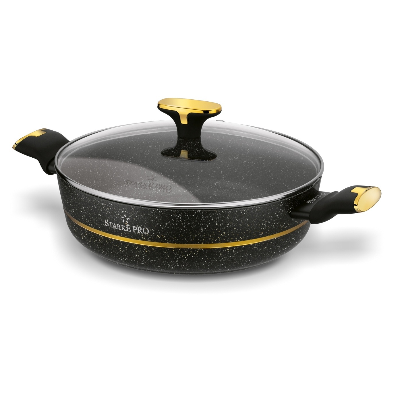 Індукційна сковорода Starke Pro Golden Marble 28 см з 2 короткими ручками і кришкою виготовлена з алюмінію. Для її створення використовувалася техніка кованого гарячого кування. Завдяки цьому він ідеально збалансований і дуже міцний з точки зору механічних і термічних властивостей. Внутрішня частина сковороди покрита антипригарним покриттям MARBLE PLUS. Його висока якість, чудова адгезія та 3-шарова структура були загартовані. Він також позначений як PFOA Free. Енергозбереження забезпечує індукційне дно. Завдяки цьому ви можете використовувати мармурову сковороду Golden Marble 28 x 8 см на будь-якій плиті. Антипригарне покриття також дозволяє смажити з невеликою кількістю жиру та легким доглядом. Він може витримувати до 10 000 циклів стирання, що в п’ять разів більше, ніж звичайні мармурові сковорідки з антипригарним покриттям, доступні на ринку. Кришка з обідком з нержавіючої сталі і непомітною системою регулювання кількості пари всередині ємності дозволяє тушкувати інгредієнти. Перенесення і використання моделі полегшують м'які ручки, які не нагріваються і не вислизають з руки. Серію Starke Pro Golden Marble з кам'яним покриттям також тестував професійний шеф-кухар Пьотр Кухарскі. Він рекомендує цю неглибоку індукційну каструлю для тривалого використання на домашній кухні. На сковорідку поширюється 3-річна гарантія від виробника - 5/6 зірок у загальних тестах якості та гарний дизайн, що поєднує в собі візерунок чорного мармуру та елементи золотистого кольору!