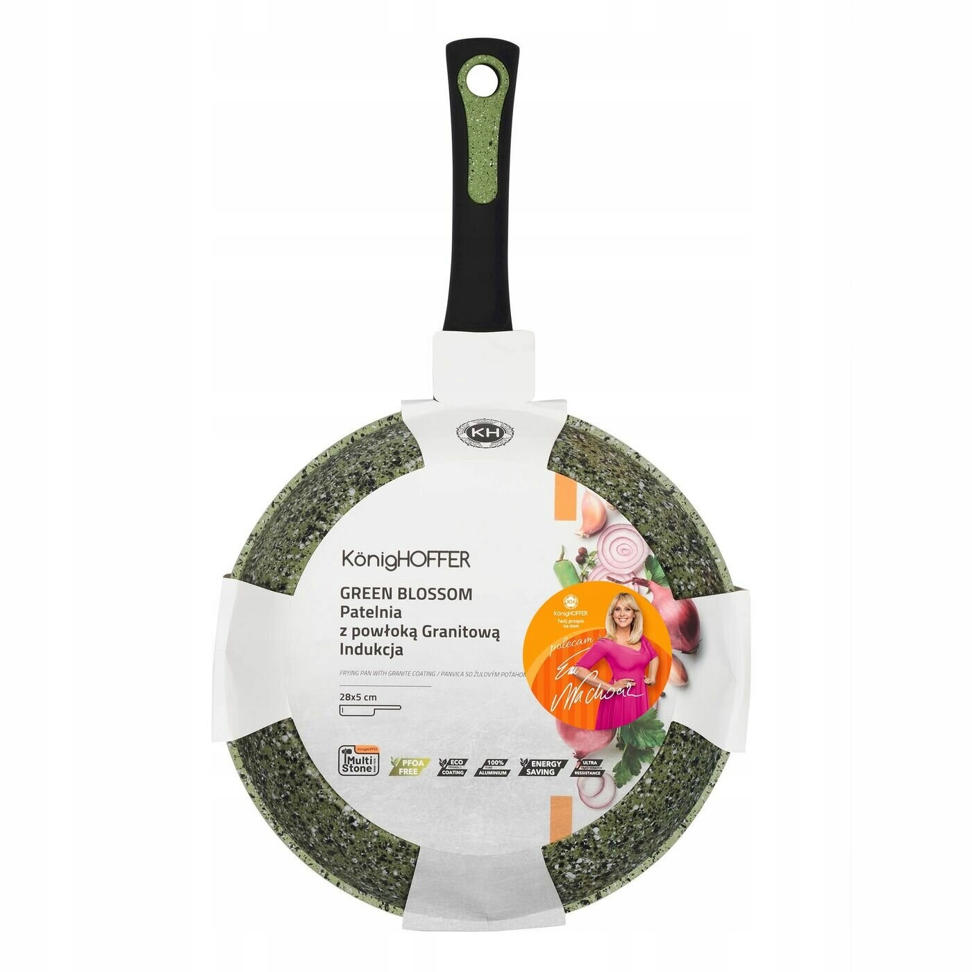 Мармурова індукційна сковорода Konighoffer Blossom Green 28 см виготовлена з алюмінію та захищає їжу від прилипання. Він дуже міцний, ідеально збалансований і добре проводить тепло. Його викували в кованій техніці. У поєднанні з ручкою soft touch це забезпечить вам високий рівень комфорту використання. Його ручка не нагрівається і не ковзає навіть при мокрій руці. Виріб працює на будь-якому типі плити, оскільки має індукційне дно. Це робить приготування їжі швидшим і економнішим. Довговічність жарильної поверхні сковороди Blossom green marble заснована на тришаровому антипригарному покритті MULTISTONE з додаванням гранітних частинок. Він не містить шкідливих речовин (наприклад, PFOA), твердий, має чудову адгезію та витримує до 10 000 циклів стирання (у 5 разів довше, ніж класичні антипригарні сковорідки). Колекція каменю Konighoffer Blossom Green натхненна чистою красою природи і рекомендована для тривалого використання на домашній кухні. Продукт рекомендований Ewa Wachowicz. Як амбасадор бренду Konighoffer, вона тепло та з усмішкою рекомендує його для домашнього використання. Разом з ним ви отримаєте свій рецепт для дому. Це один з найкращих варіантів у цій категорії!