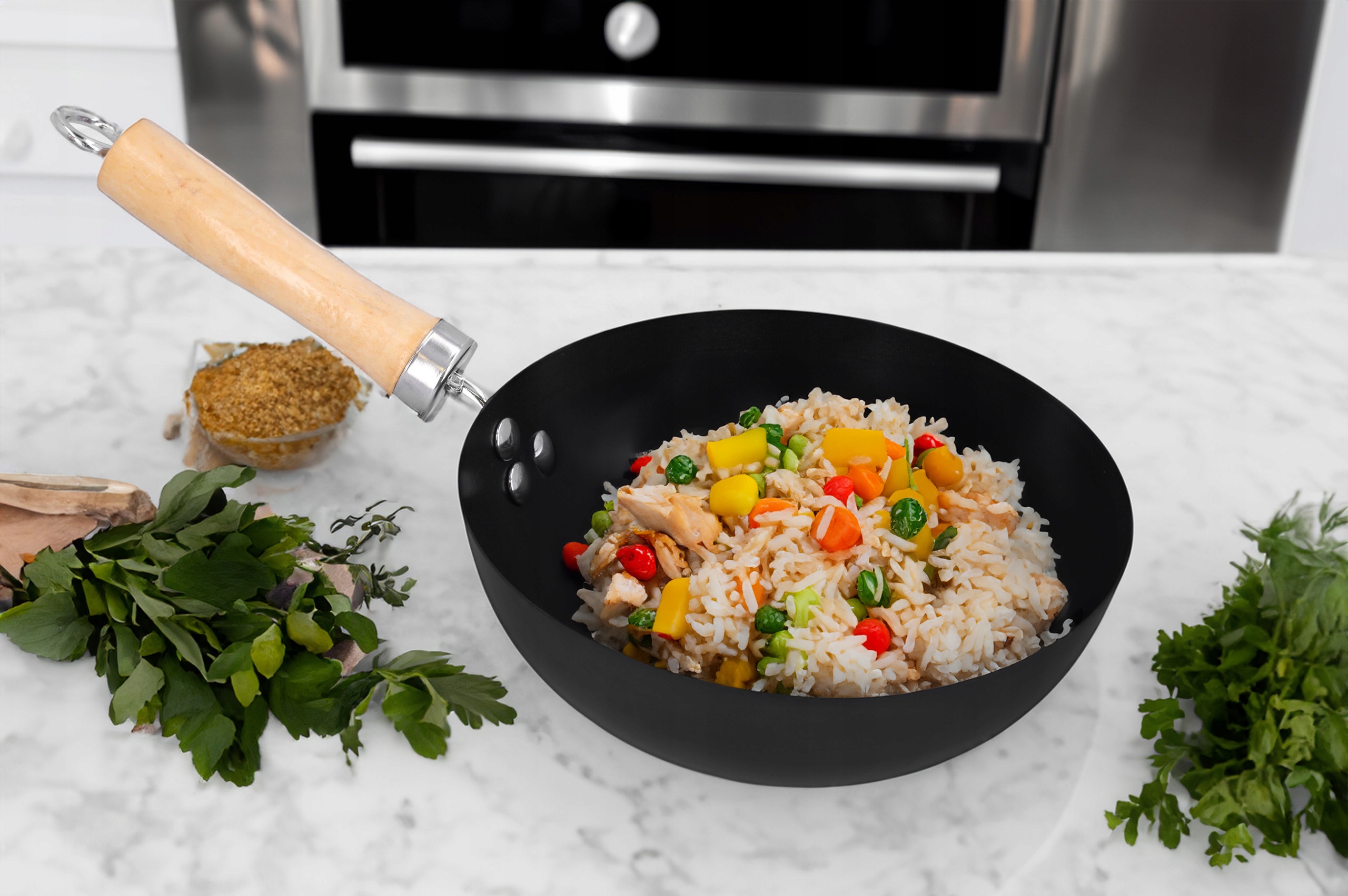Наш вок виготовлений з вуглецевої сталі з антипригарним покриттям і дерев'яною ручкою, яка гарантує відмінний контроль під час приготування. Його компактний розмір ідеально підходить для невеликих домогосподарств або для приготування однієї порції.