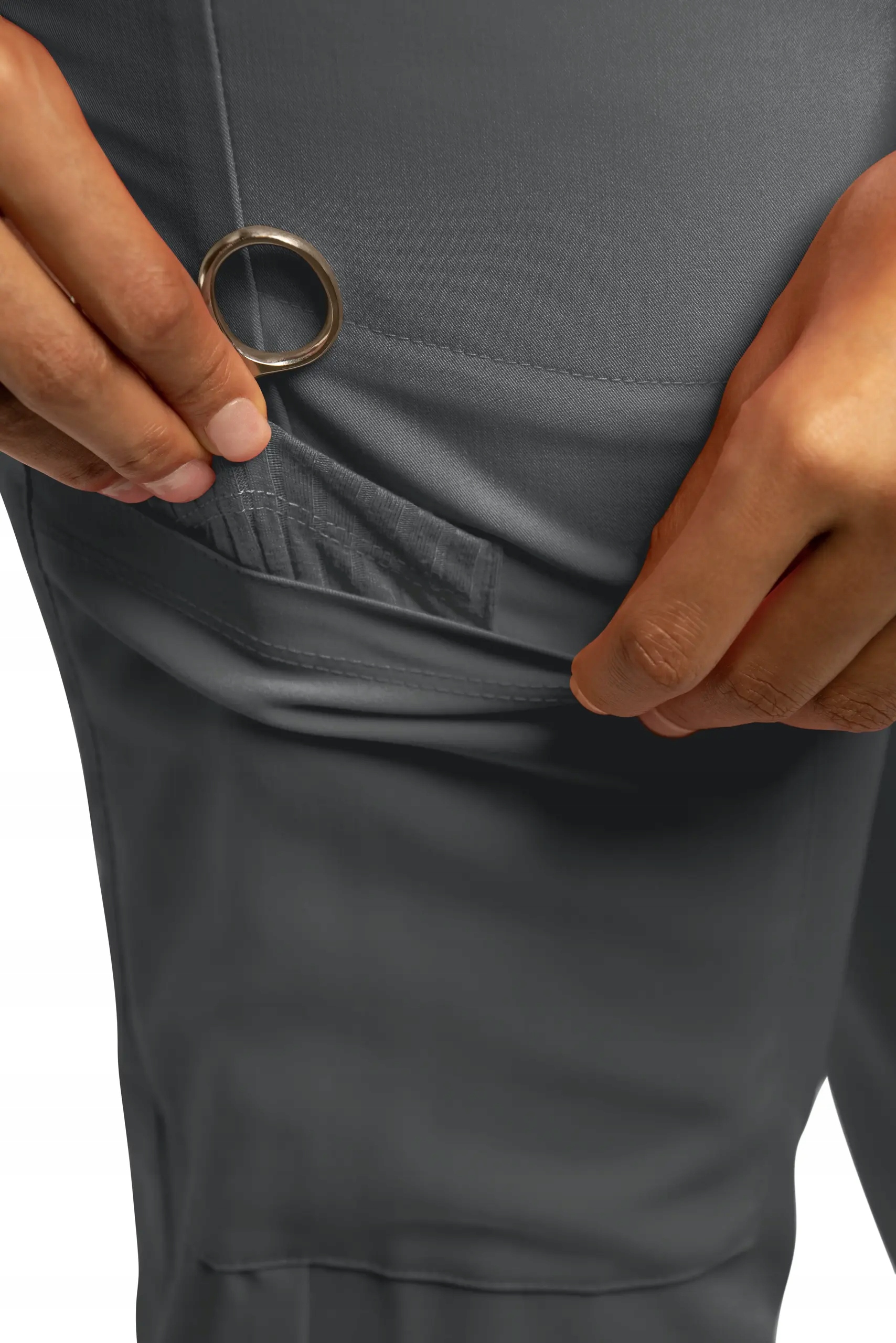 Облягаючі джоггери з останньої колекції OLI з дихаючої, дуже м’якої тканини. Одного разу одягнені, вони як друга шкіра. Виготовлені зі штучного шовку, двох видів високоякісного поліестеру та спандекса, вони забезпечують комфорт протягом всієї зміни. П'ять непомітних кишень дозволяють носити з собою всі необхідні для роботи речі (стетоскоп, ножиці, блокнот). Додаткова куліска на талії медичних штанів утримує їх на місці та запобігає сповзанню під час роботи з пацієнтом. Нижні м'які манжети на щиколотці не дозволяють бігунам «заплутатися» і не заважають виконувати щоденні обов'язки лікаря. Вони зроблять вашу зміну більш зручною та комфортною, незалежно від умов у лікарні чи іншому медичному чи стоматологічному закладі. Модний дизайн медичних штанів для бігу дарує відчуття елегантності та охайного вигляду на роботі.