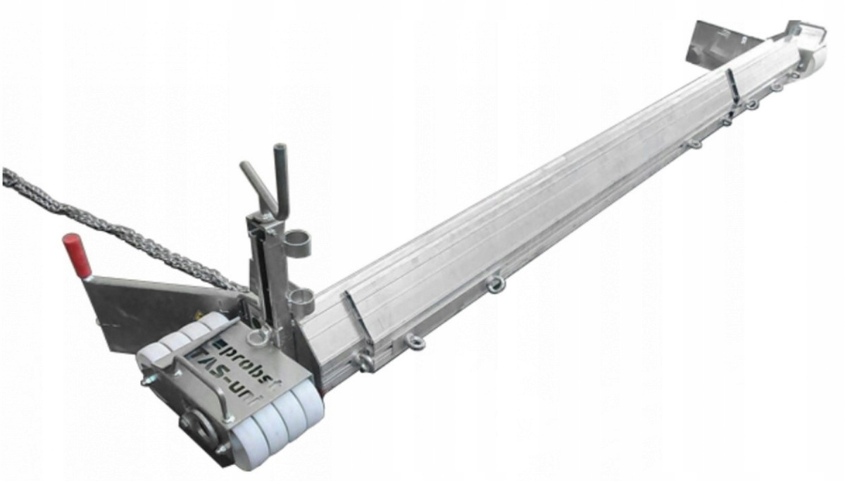 - Включеноз алюмінію 750, 1000, 1750, 2000, 3000 мм завдовжки з інтегрованим регулюванням затискачів, регульованими по висоті роликовими блоками з металевими сходинками та скребками для листового металу з інтегрованим кріпленням для необхідних сегментів з гаком для лопати системою та двома тяговими ланцюгами з гачками