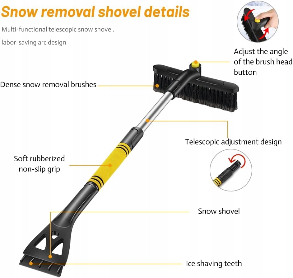 - Він поєднує ДВІ функції прибирання снігу та розморожування - його легко носити. Підходить для легкових автомобілів, позашляховиків, вантажівок, караванів, вантажівок.