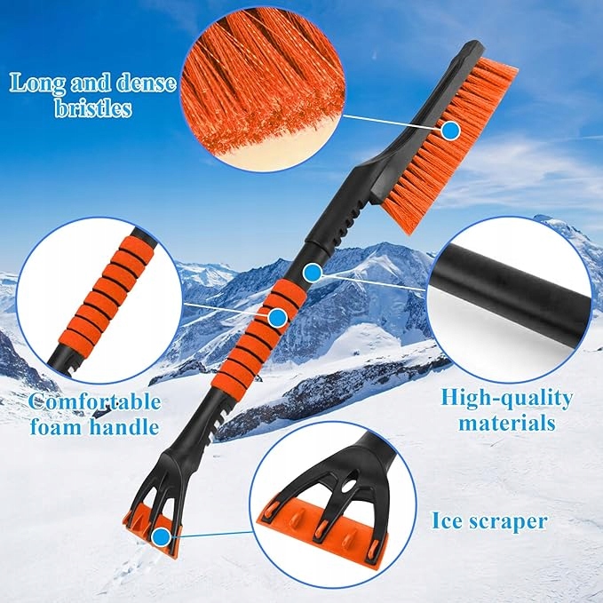 Щітка виготовлена з міцного стрижня з АБС-пластику, щетини з ПВХ і піни EVA, тож ви можете справлятися з сильним снігом, не подряпавши фарбу автомобіля.