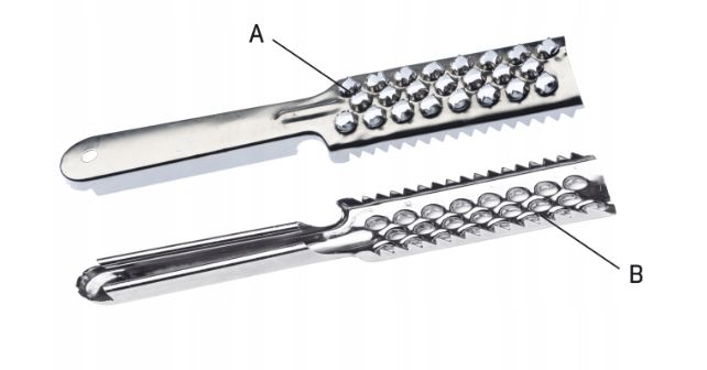 Двосторонній скребок. Сторона А: риба з твердою компактною лускою - окунь, судак. Сторона B: риба з лускою, яка легко знімається - плотва, лящ, щука тощо.