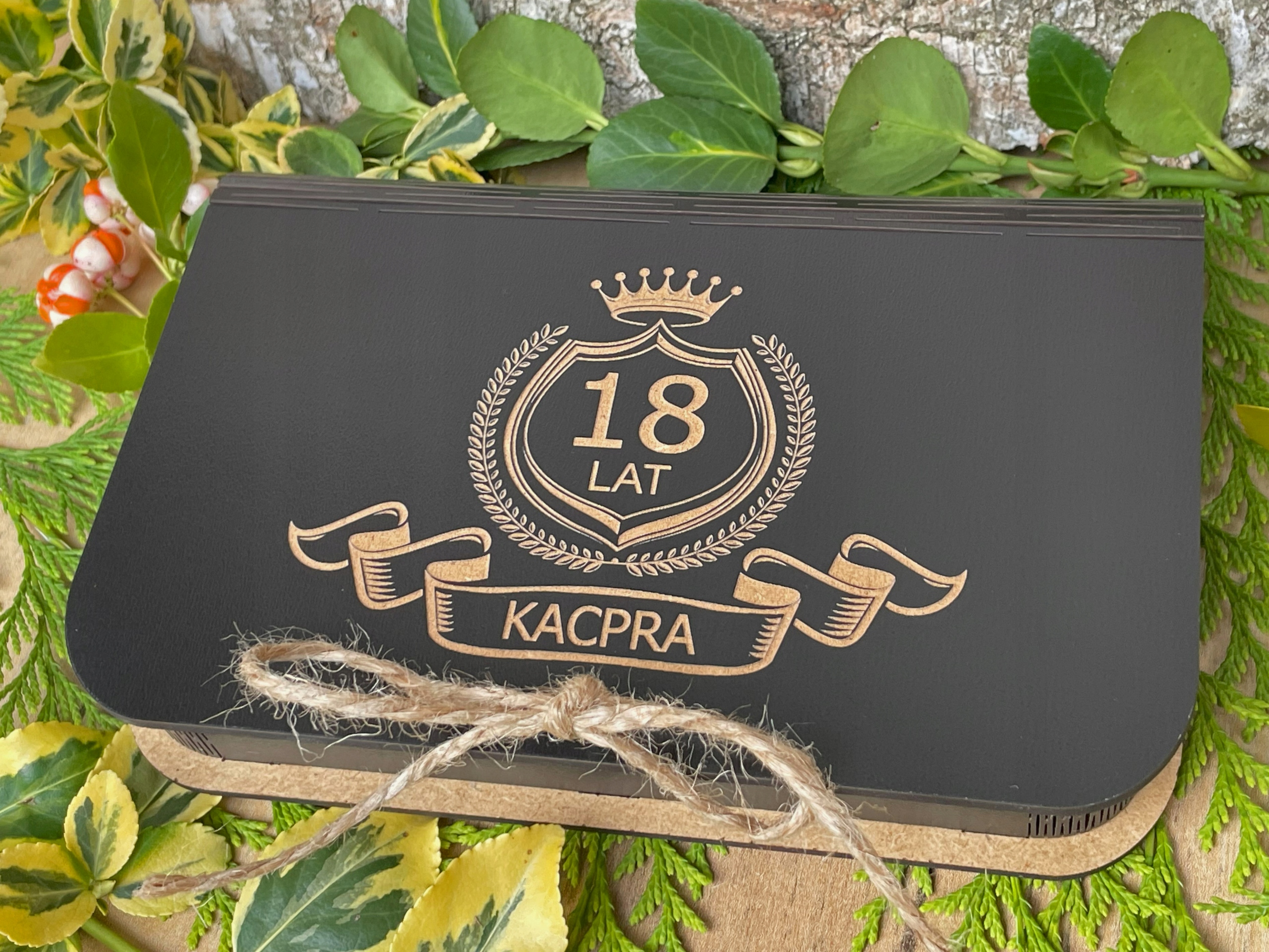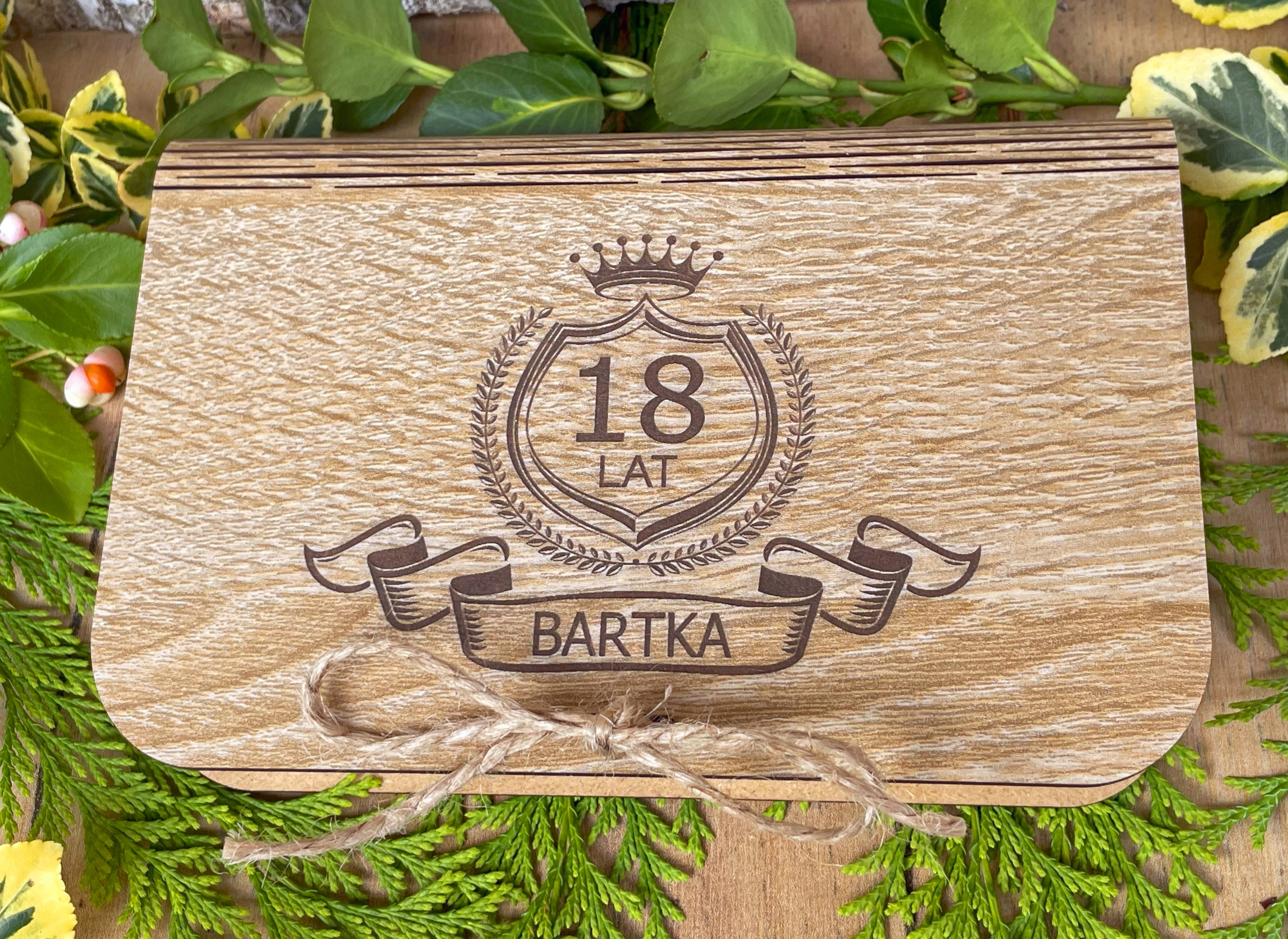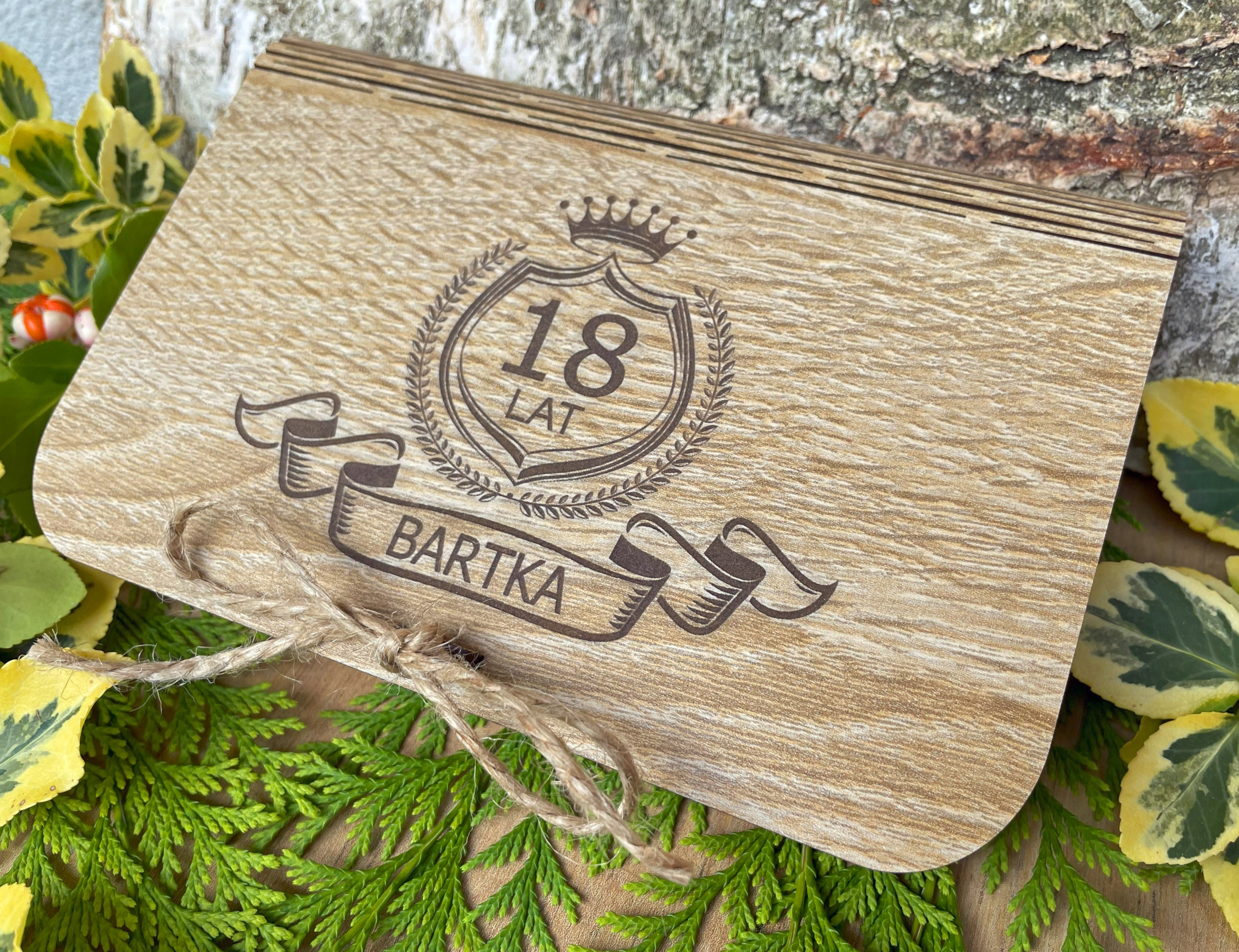 Красива дерев'яна скринька з гравіюванням для грошей або іншого подарунка на день народження чи ювілей.