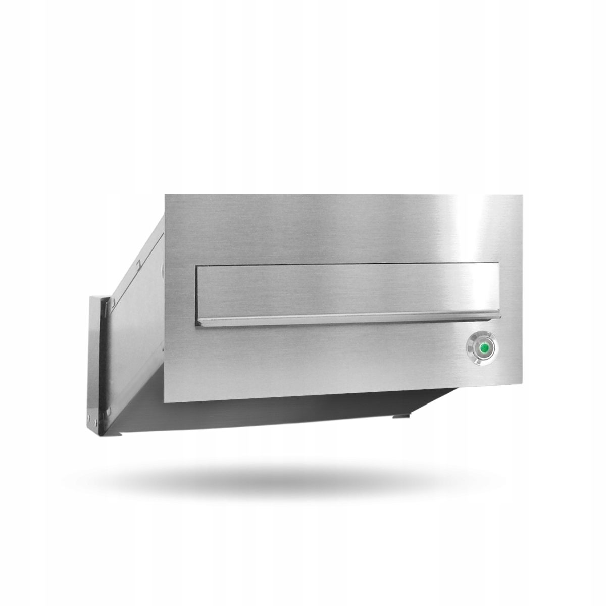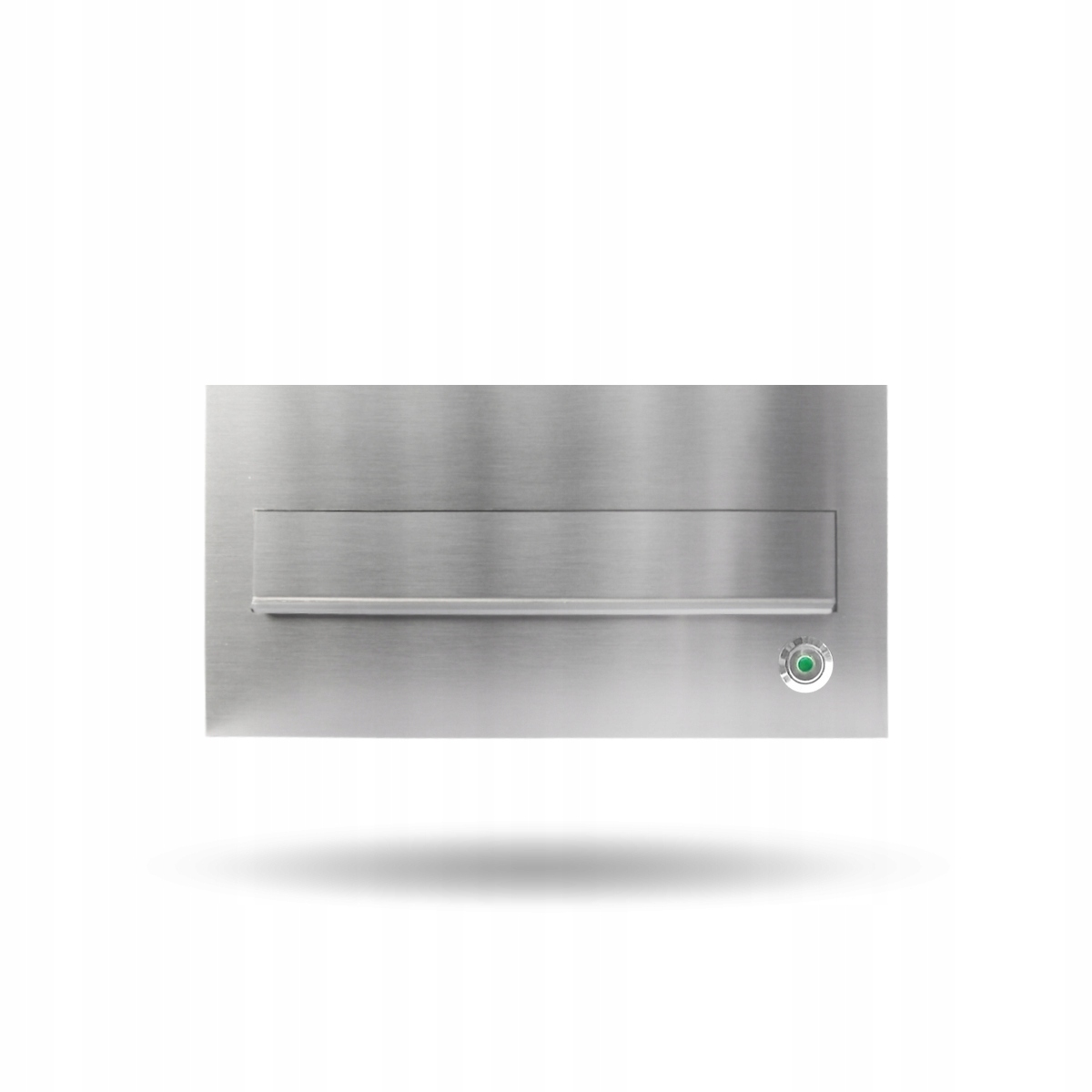 Сучасна прохідна поштова скринька з підсвічуванням кнопки дзвінка, вмонтована в стіну.