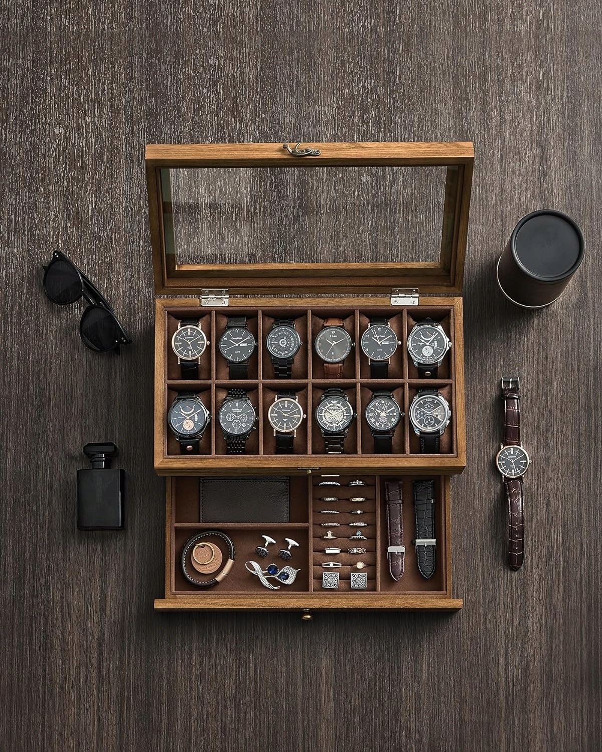 ✔️ Велика місткість і організація: коробка має 12 відділень для годинників у першому шарі, що ідеально підходить для зберігання різних годинників. У нижній шухляді є різні відділення, які допоможуть вам упорядкувати ремені, каблучки та запонки.
