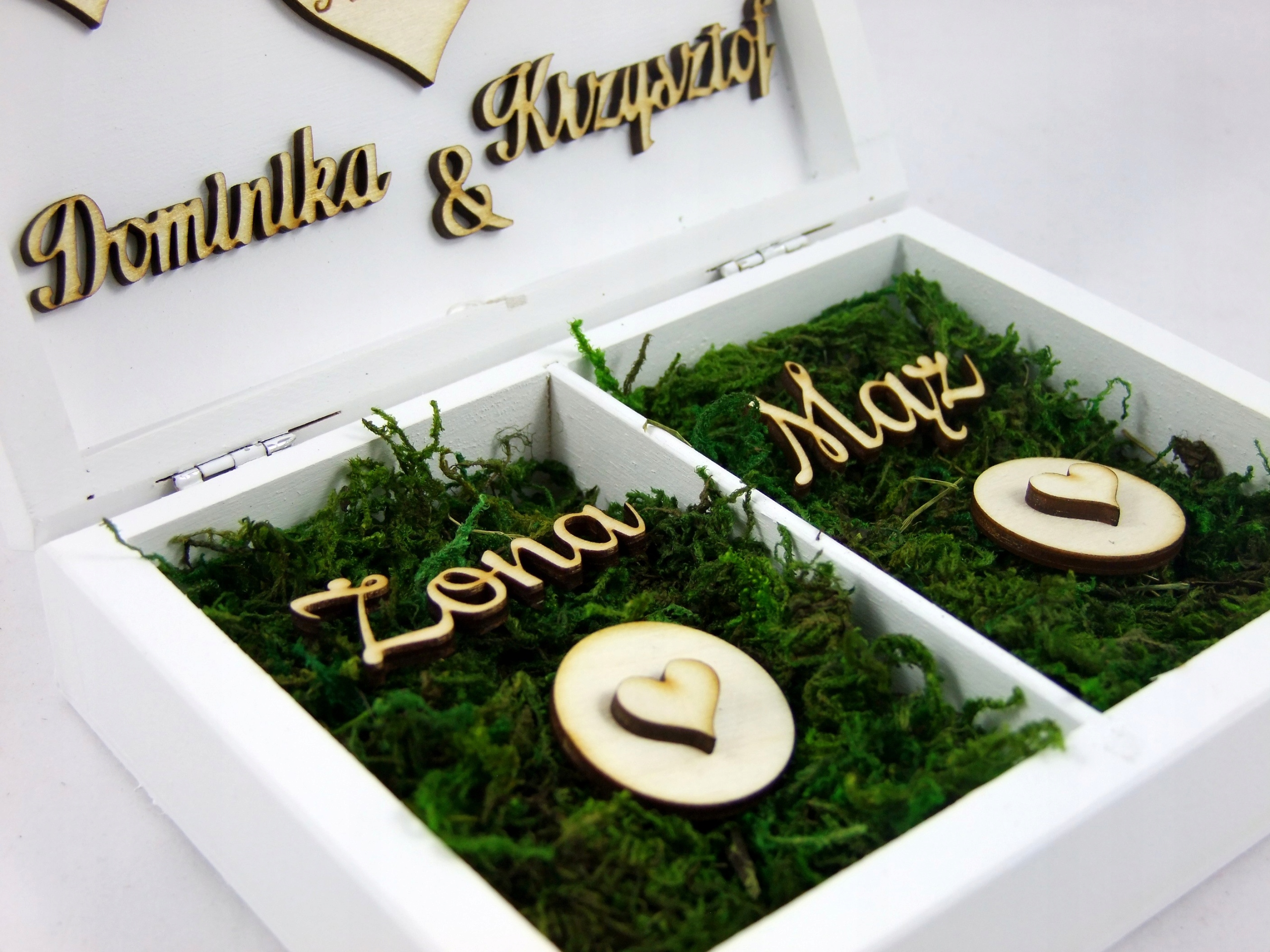 Наповнювач — красивий зелений мох із вирізаними словами «Дружина та чоловік»і двома сердечками для обручок