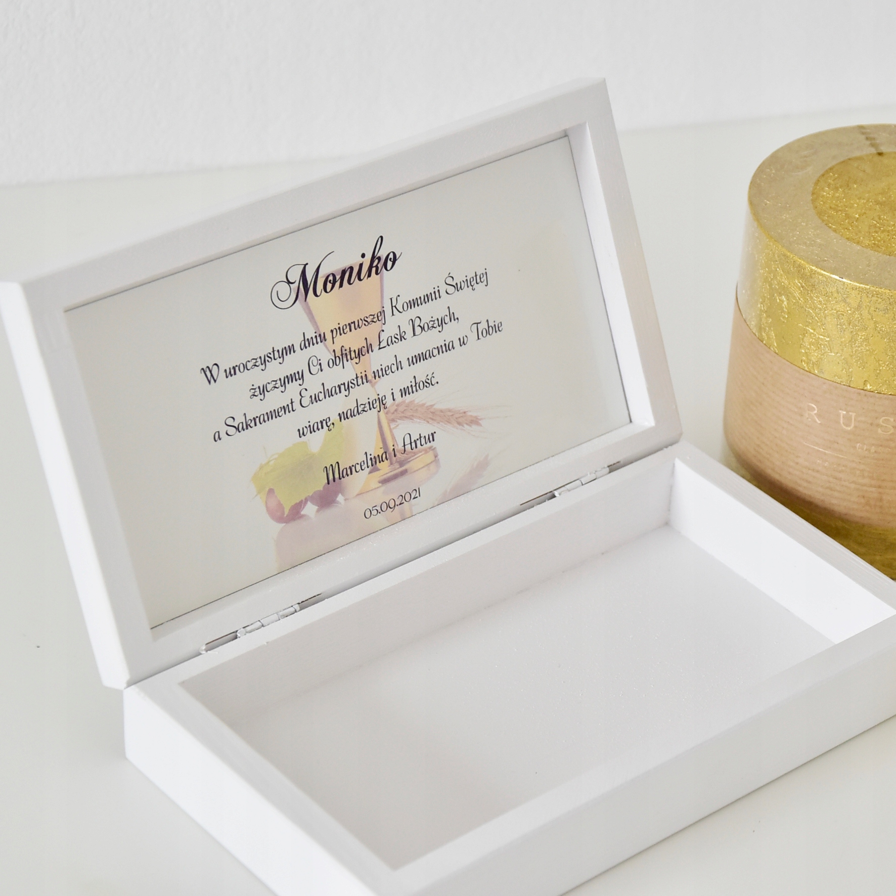 Дерев'яна та гравірована скринька для Першого Святого Причастя.