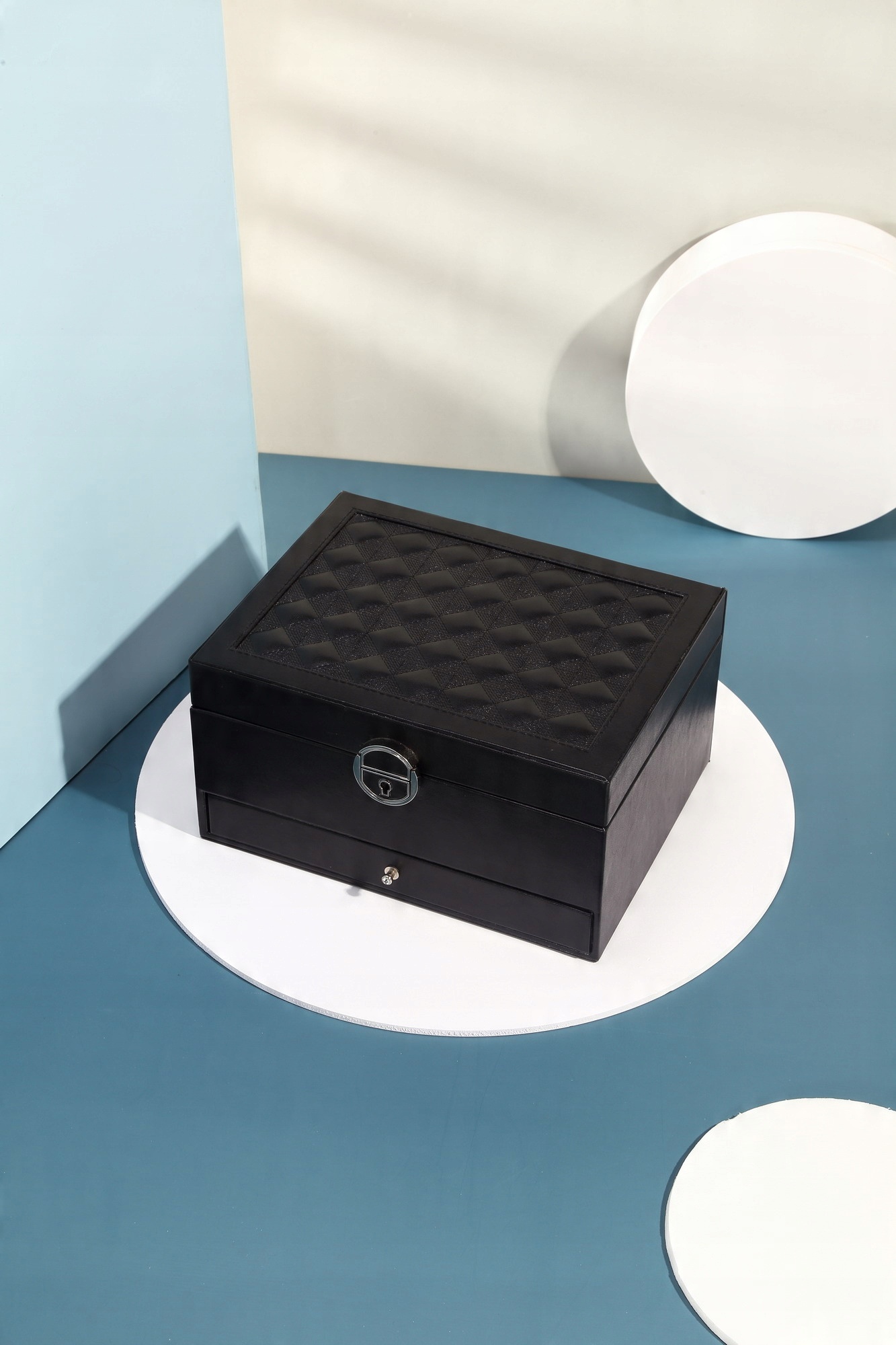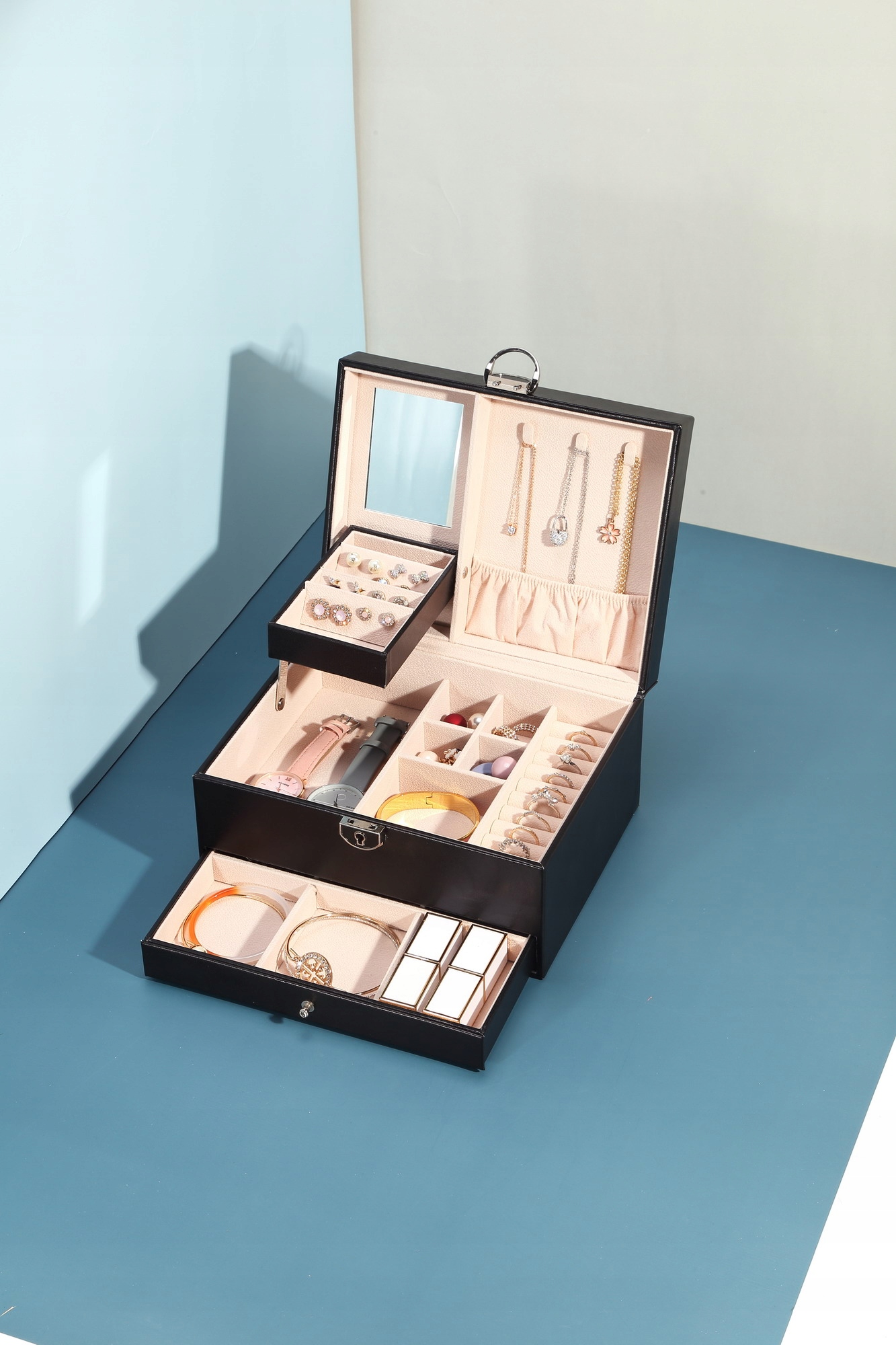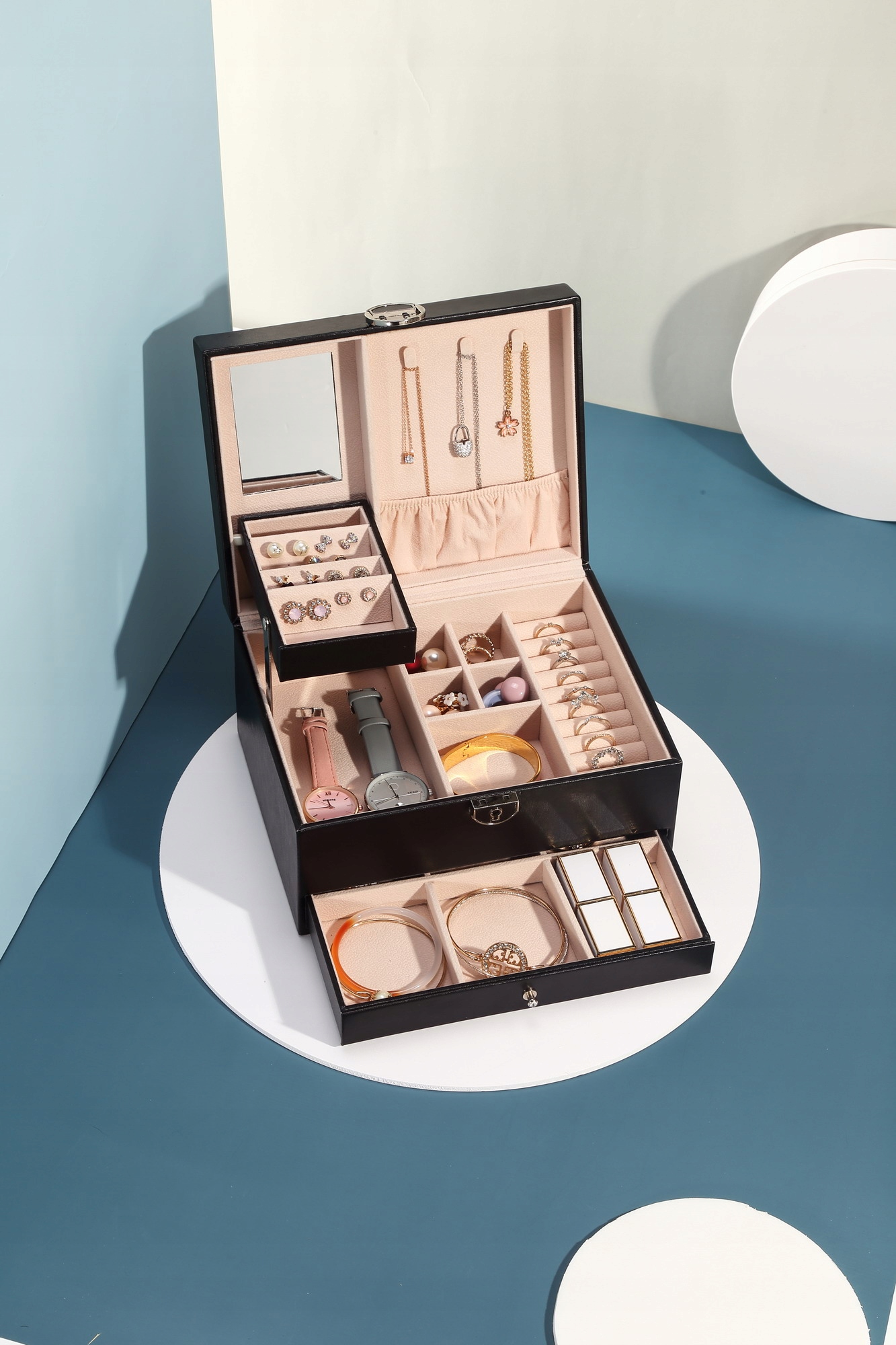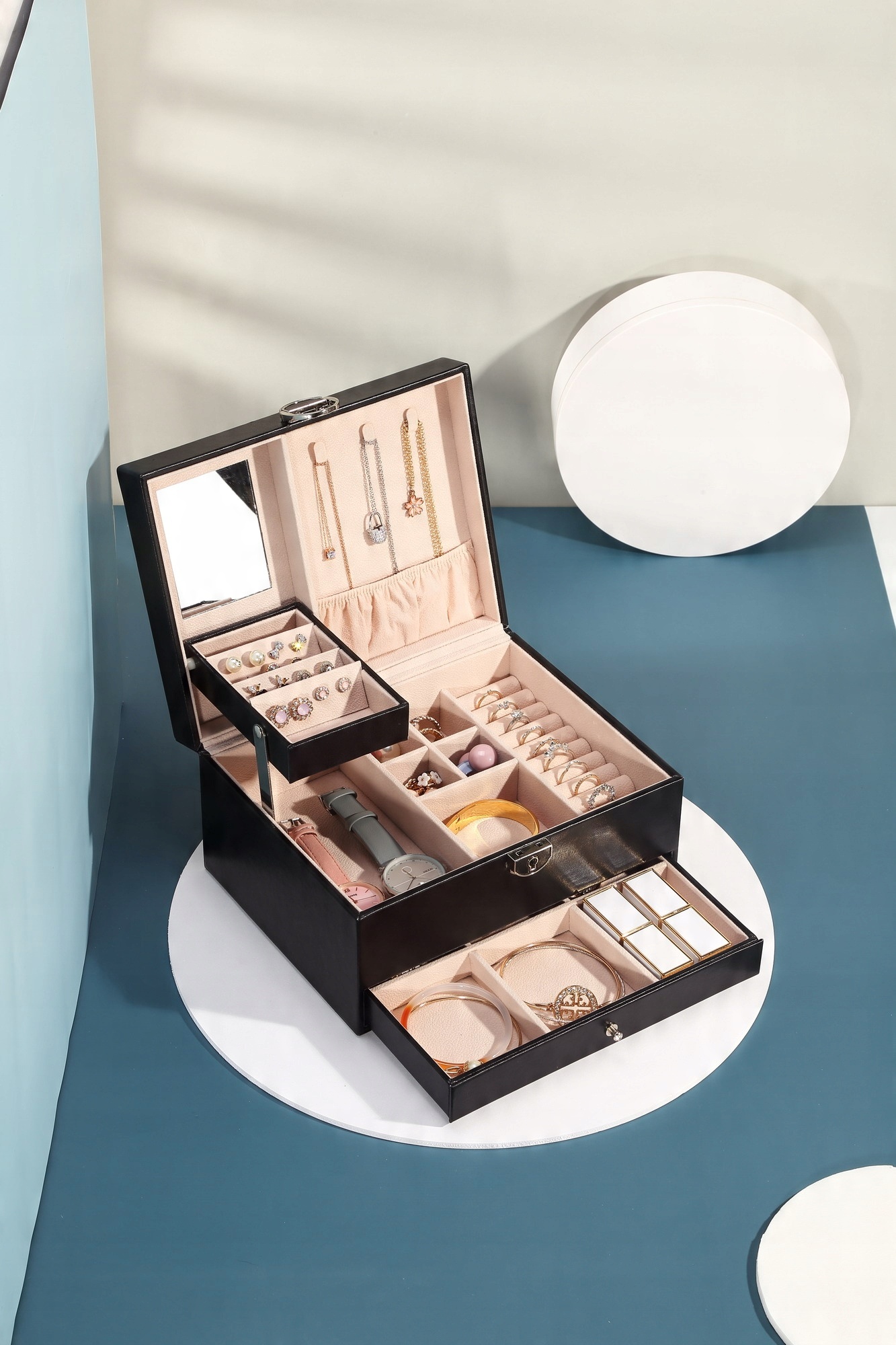 Зберігайте свої ювелірні вироби в безпеці та порядку за допомогою красивої скриньки для коштовностей від Aspeco. У цій міцній розкішній коробці є все необхідне для створення ідеального рішення для зберігання. З окремим відділенням для браслетів, місцем для сережок і каблучок і нижньою висувною шухлядою ви можете організувати його відповідно до своїх потреб. Крім того, він оснащений ключем, який забезпечує збереження ювелірних виробів, і дзеркалом для огляду.
