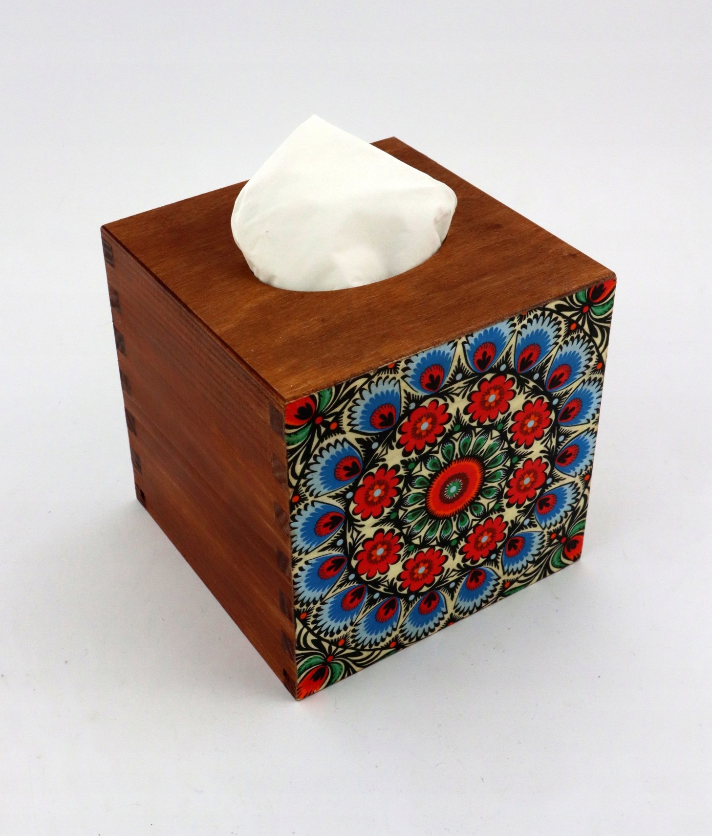 Хустинка квадратна, дерев'яна, ручний розпис, відкривається знизу. Оздоблено на дві стіни методом декупаж, фольклорний мотив.