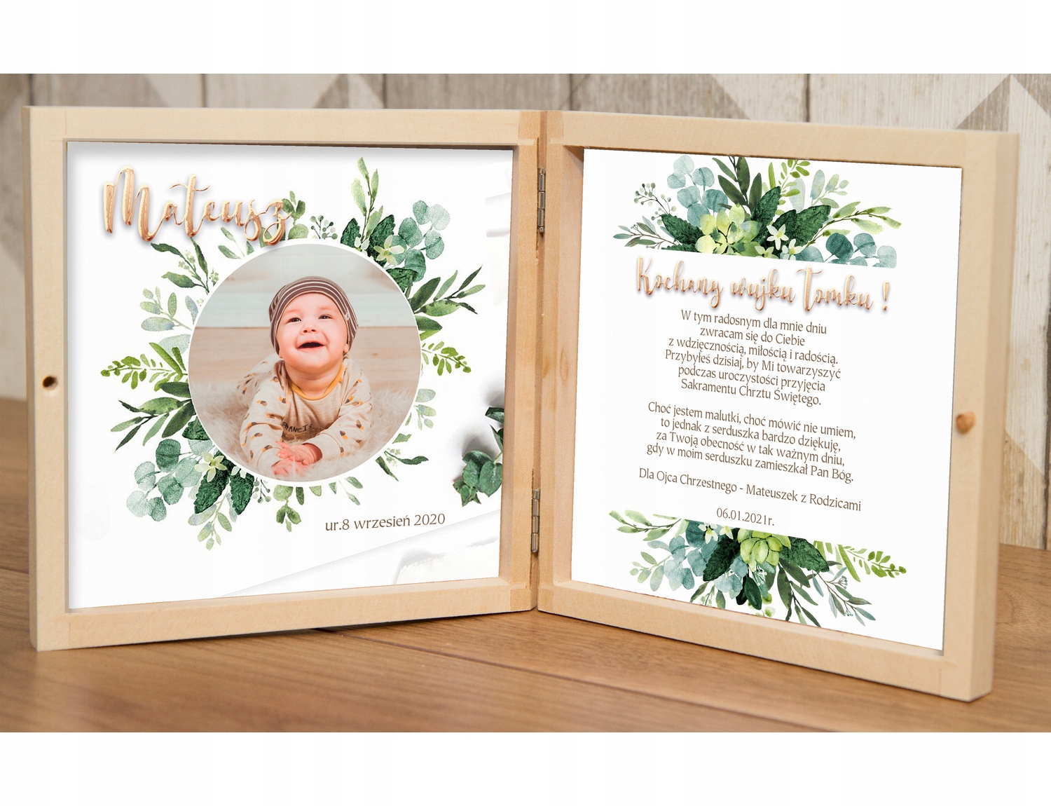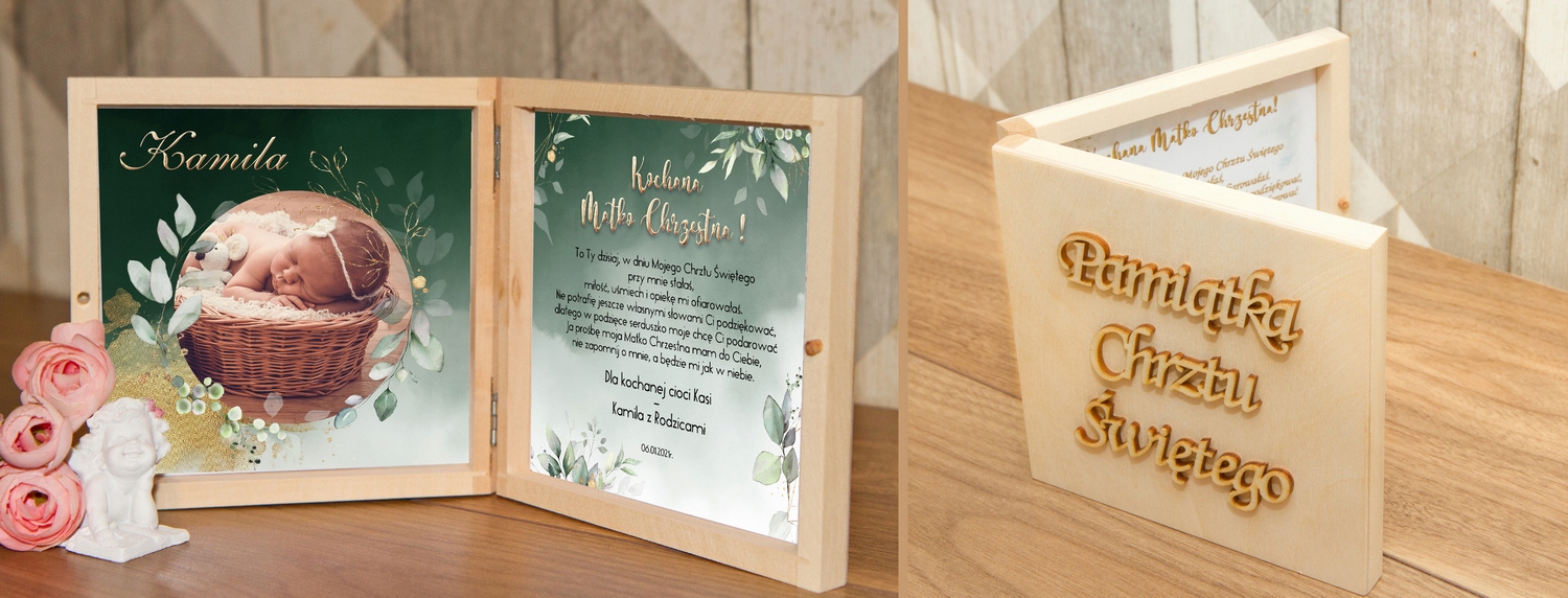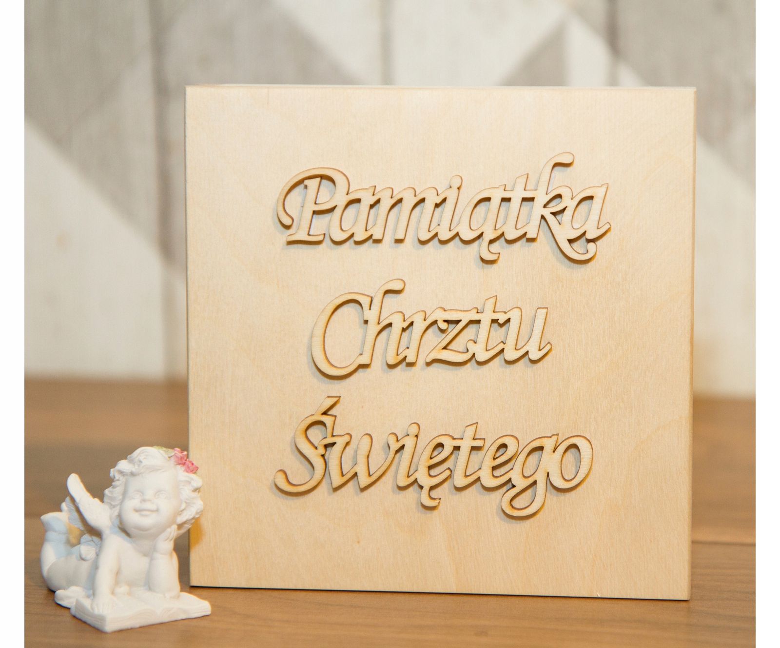Коробка прикрашена написом "Сувенір на Хрещення", вирізаним лазером на дереві