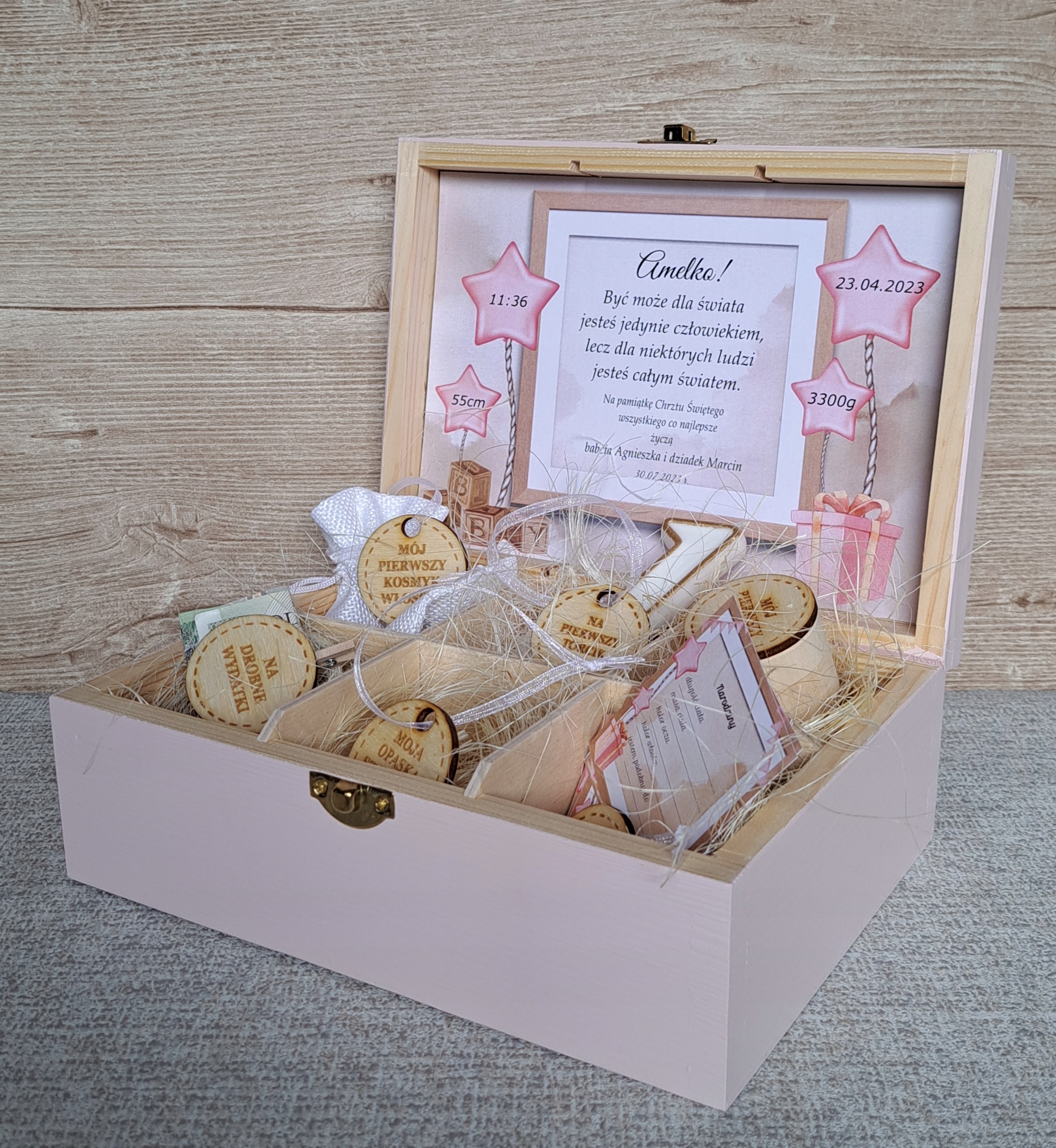 Дерев'яна скринька, розписана вручну, стане унікальним та оригінальним подарунком для новонародженої дитини.