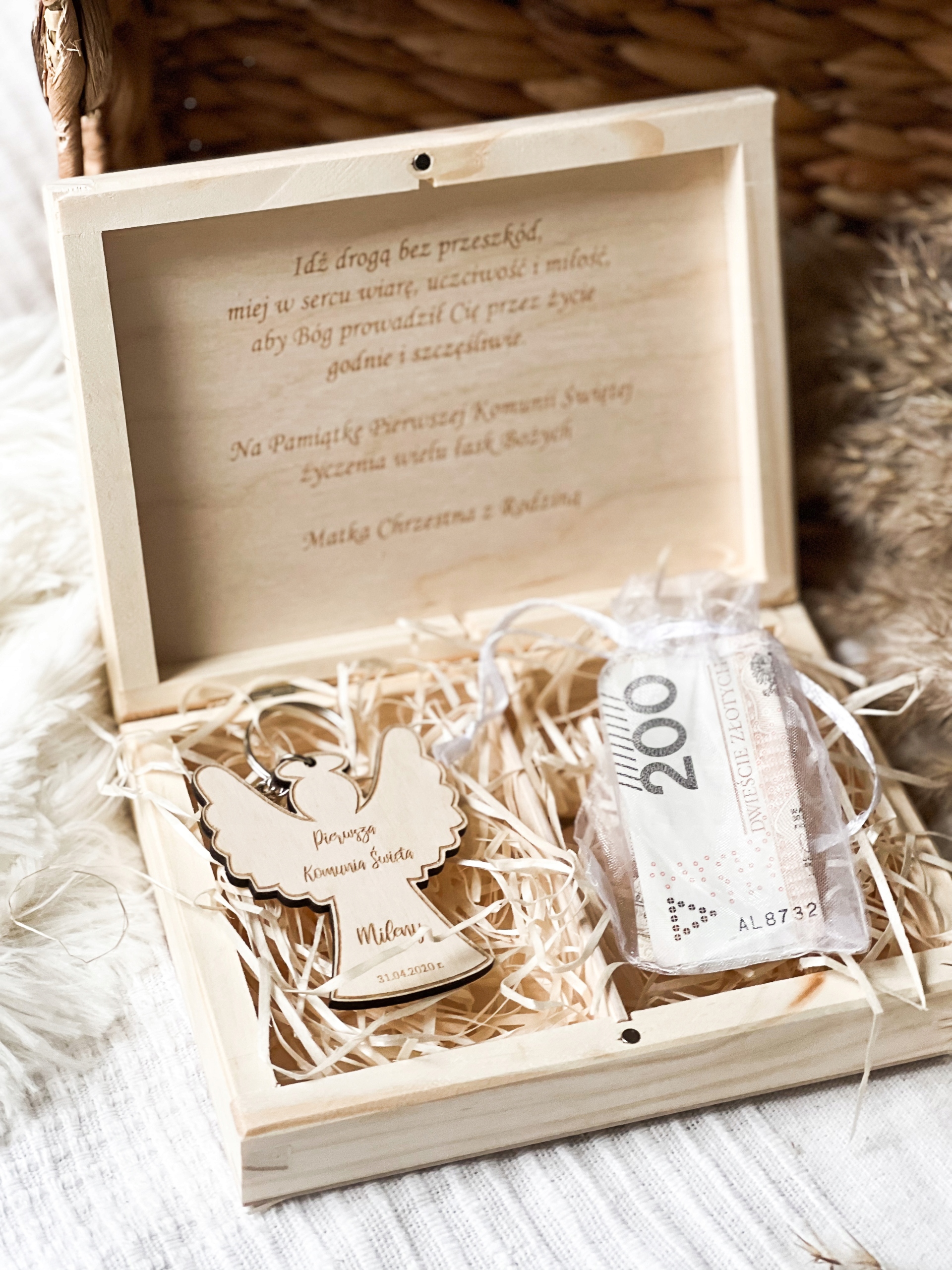 Це стане унікальним подарунком до Першого причастя, який замінить паперову листівку та сувенір на довгі роки! Коробка закривається на магніт. В комплекті брелок з гравіюванням - він буде персоналізований відповідно до даних, наданих у повідомленні.