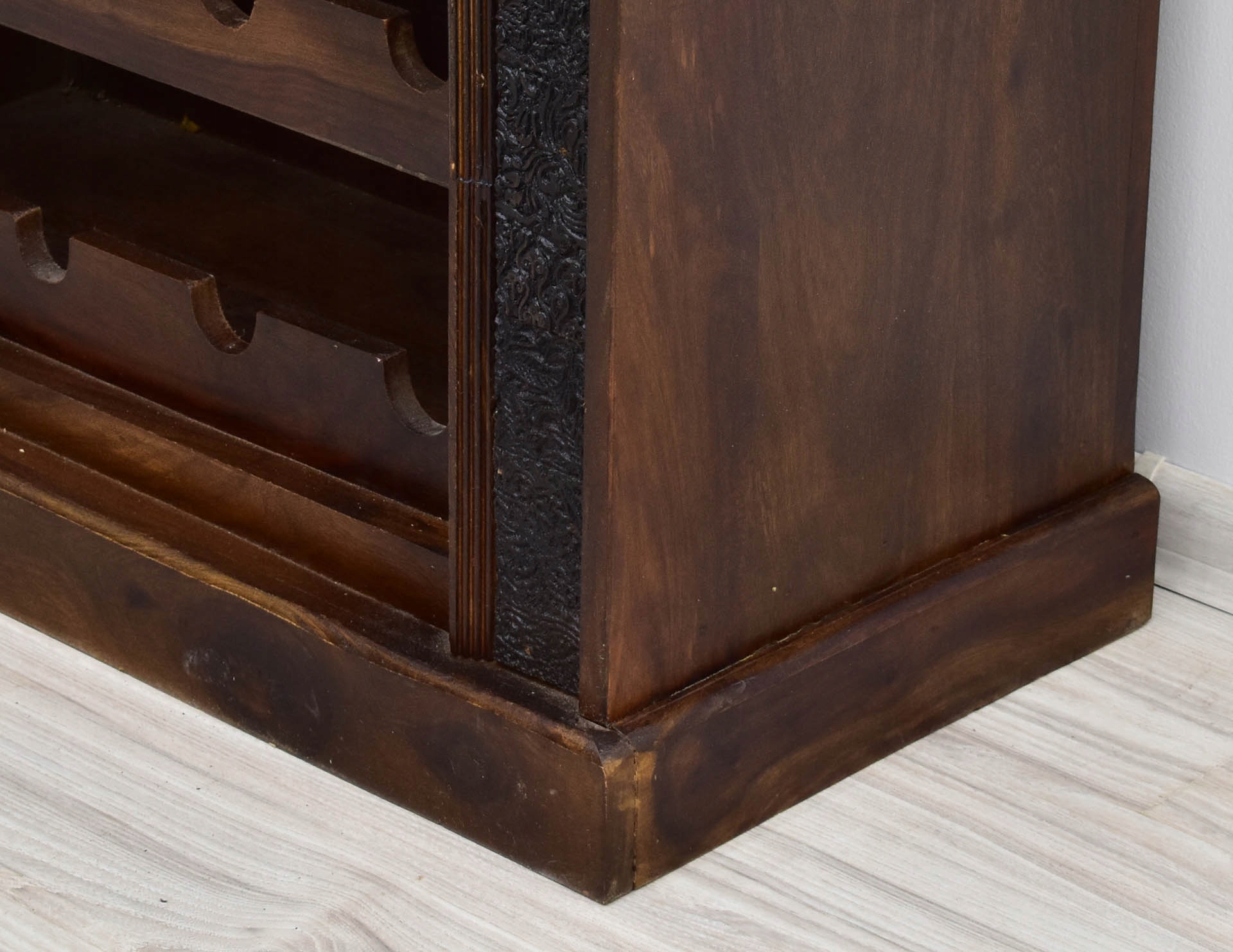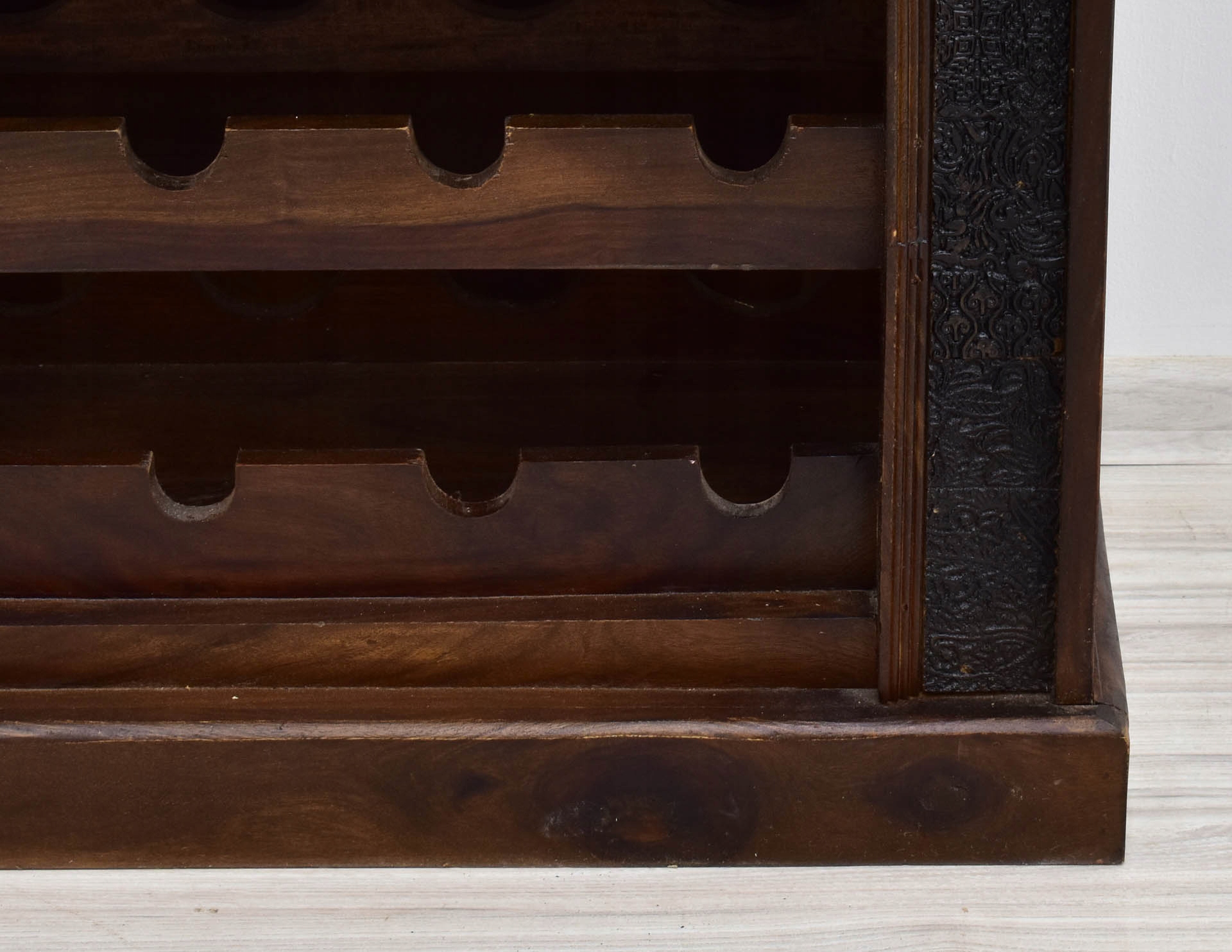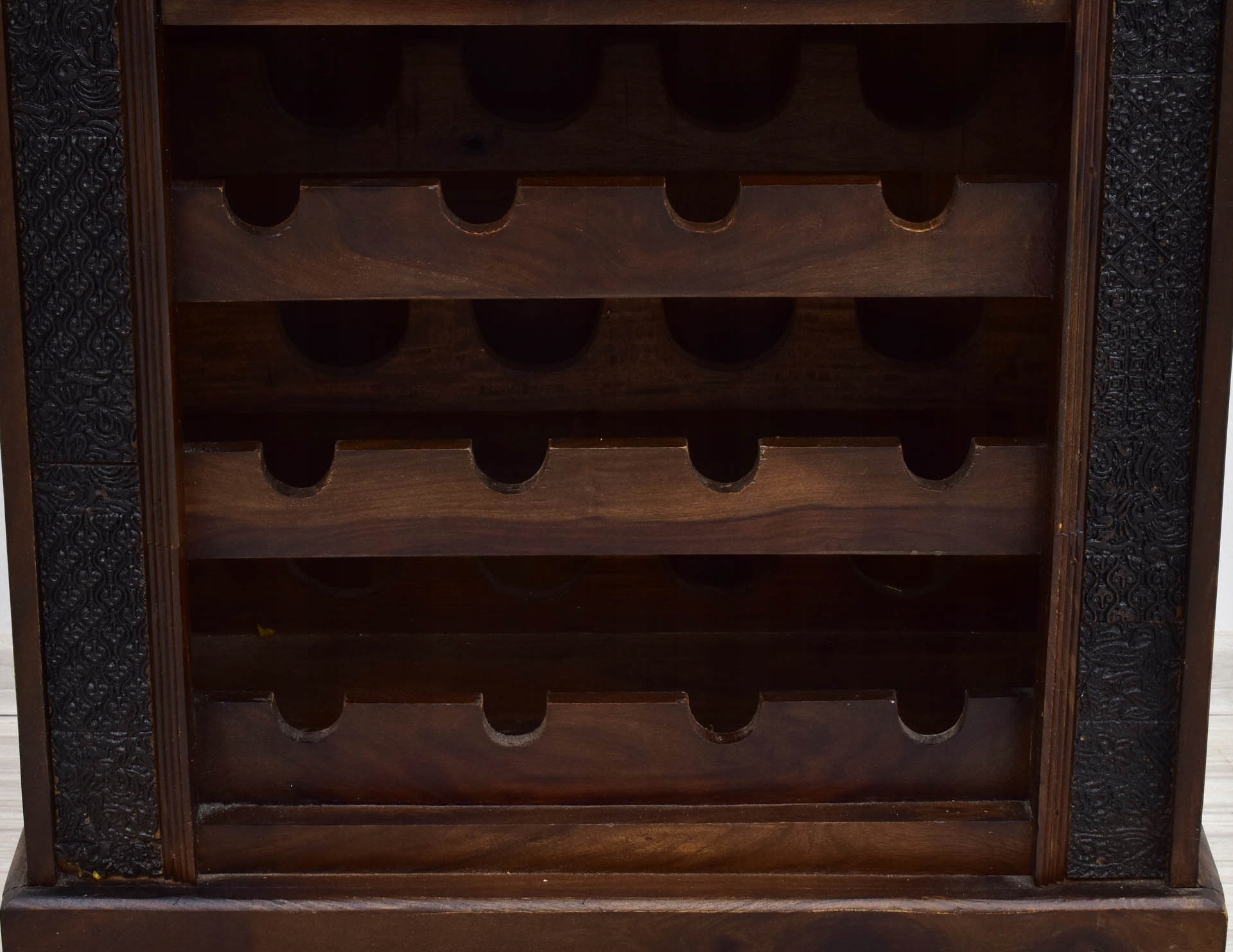 4 Ніші були приховані за різьбленими фронтами, які були додатково прикрашені металевими деталями, такими як масивні ручки або смужки та шпильки. Навколо передньої стінки комода був проведений пояс з хитромудро скульптурним орнаментом. Меблі були створені 100% деревини індійської палісандри і вміщують 12 пляшок благородного напою.