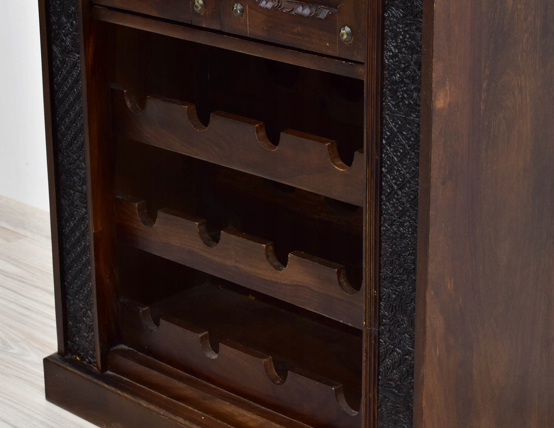 4 Ніші були приховані за різьбленими фронтами, які були додатково прикрашені металевими деталями, такими як масивні ручки або смужки та шпильки. Навколо передньої стінки комода був проведений пояс з хитромудро скульптурним орнаментом. Меблі були створені 100% деревини індійської палісандри і вміщують 12 пляшок благородного напою.