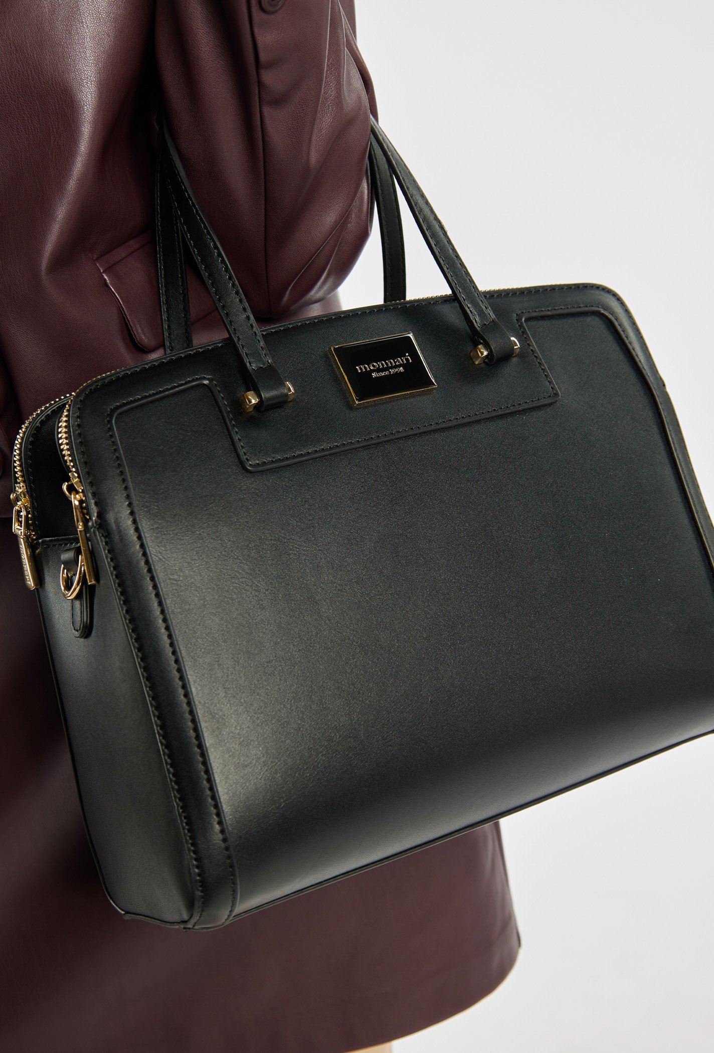 - Жіночий скринька з логотипом бренду Monnari. Модель на два відділення з яскравою підкладкою з логотипом і практичними кишенями для дрібниць. Підвішений на ручках, в комплект входить регульований ремінь, який дозволяє носити його на плечі. Сумка повинна зберігатися в сумці, що надається. Розміри: 31 см x 26 см x 11,5 см.