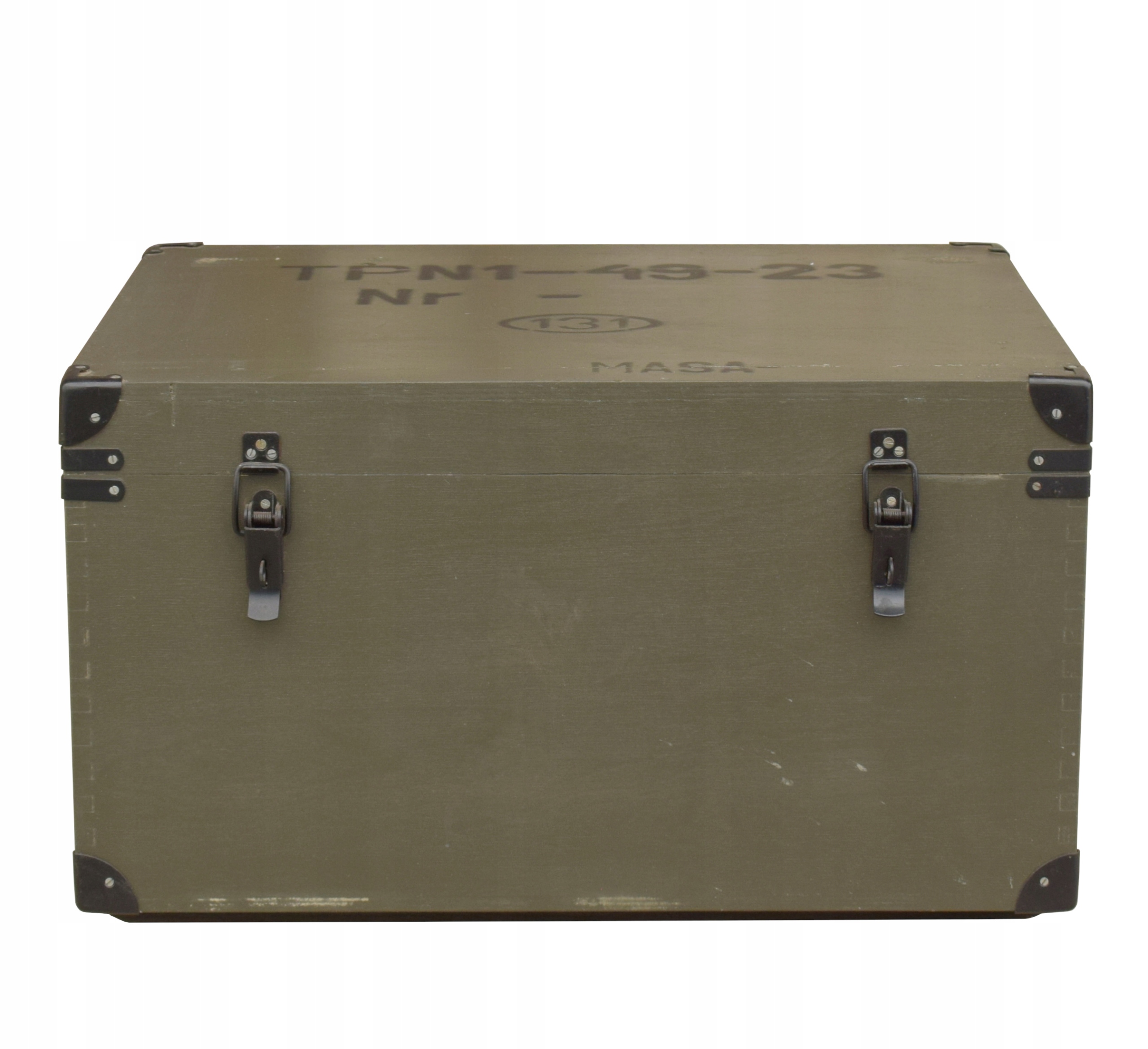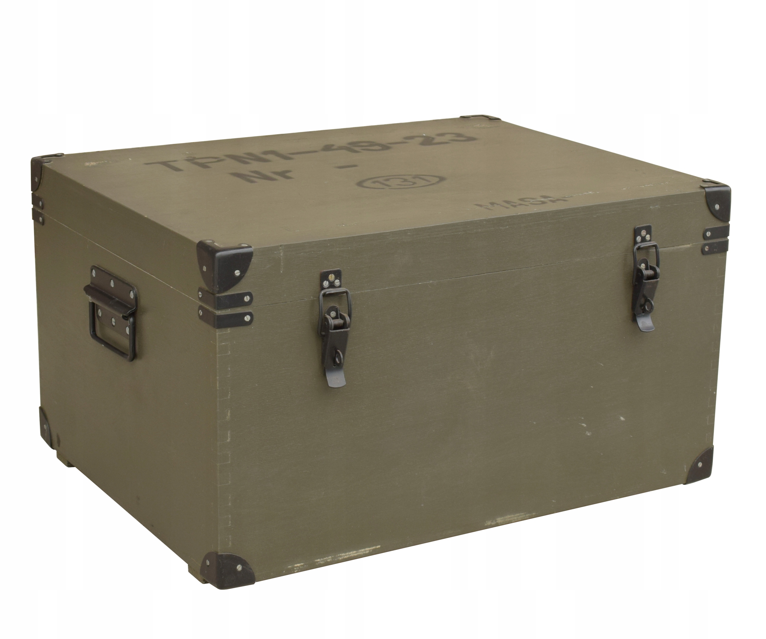 Унікальний військово-транспортний ящик. Він має металеві ручки та фурнітуру на кожному куті. Кришка закривається на дві застібки.