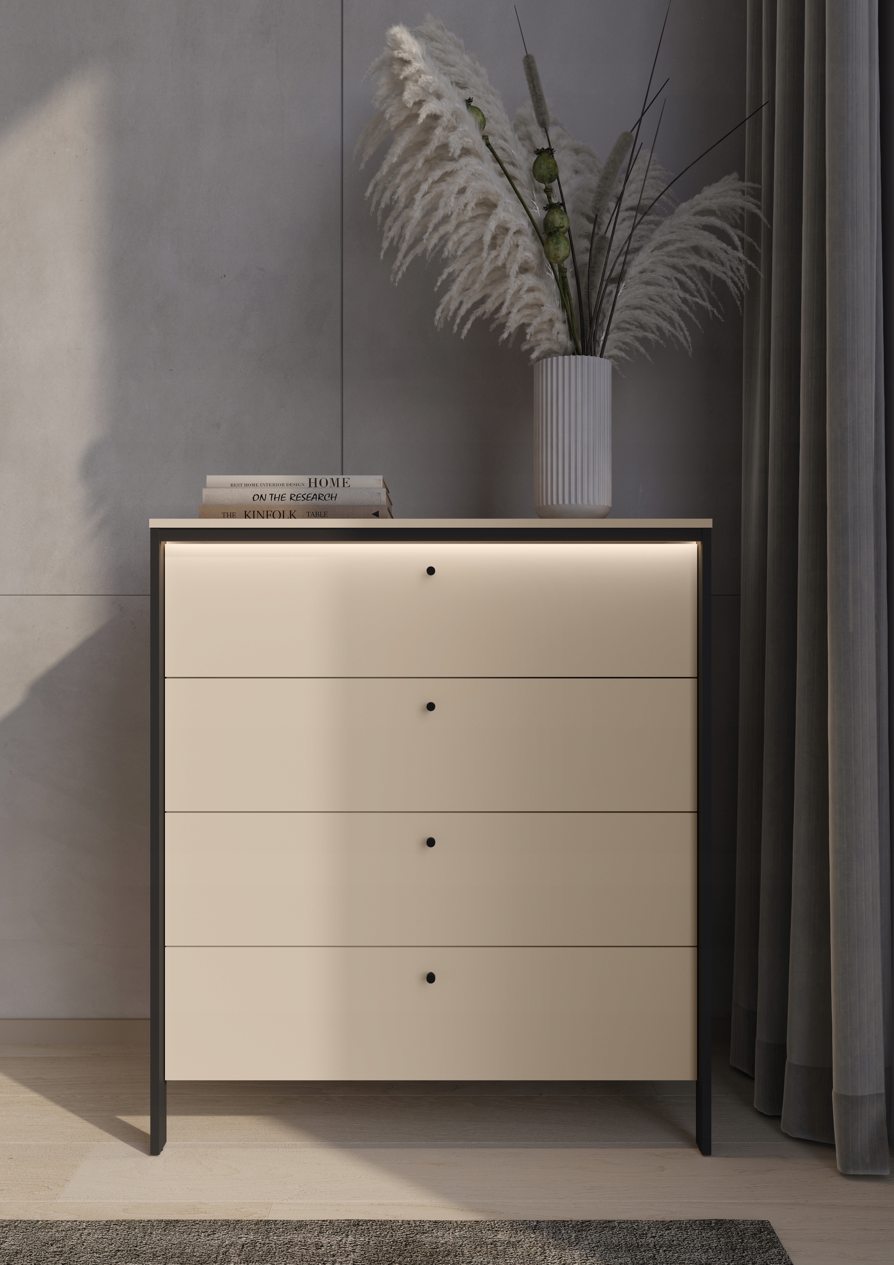 комод з чотирма містками ящиків, що є частиною колекції Enna. Розроблений як частина обладнання для спальні. Забезпечує додатковий простір для зберігання одягу та аксесуарів. Перевага продукту - це підсвічування. Шкідель з ящиками з ящиками для спальні поєднує функціональність та витонченість. Це предмет меблів, який не лише виконує свою роль як місце для зберігання одягу та постільних речей, але й підкреслює унікальний характер інтер'єру, в якому він був розміщений. Христота з колекції Енна забезпечує багато місця для збору та відокремлення речей, які щодня знаходяться в нашій спальні. Це дозволяє легко організувати простір у нашому місці відпочинку. Суцільна конструкція та ретельно підібрані матеріали - це ще одна переваги нашого продукту. Шкідель з ящиками з ящиками для спальні - це рішення, яке полегшує організацію місця та надає спальні унікальну принадність.