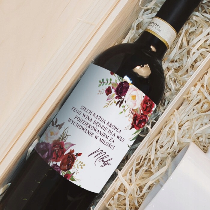 - Всередині етикетка з мотивом квітів, бордових троянд із зворушливою подякою батькам