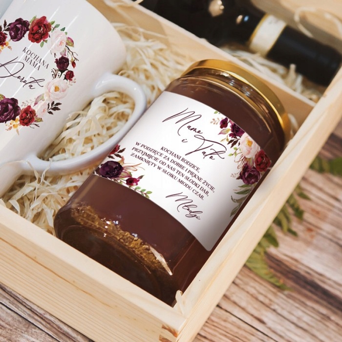 - У набір входить: персоналізована етикетка для вина, літрова банка меду з персоналізованою етикеткою та дві красиві кухлі з іменами батьків. Чашки прикрашені красивими квітковими вінками, на яких також є написи Дорогий тато, дорога мама
