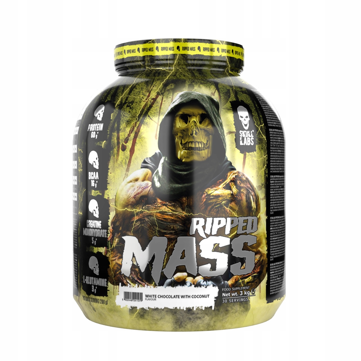SKULL LABS® RIPPED MASS. Дієтична добавка.Містить підсолоджувач. Гейнер останнього покоління. Порошок для приготування поживного білково-вуглеводного напою, збагаченого креатином і L-глутаміном. Призначений для дорослих, які виконують фізичні вправи високої інтенсивності. Білок сприяє зростанню і підтримує м'язову масу. Креатин підвищує фізичну працездатність у разі послідовних коротких, дуже інтенсивних фізичних вправ, і сприятливий ефект спостерігається після споживання 3 г креатину на день.