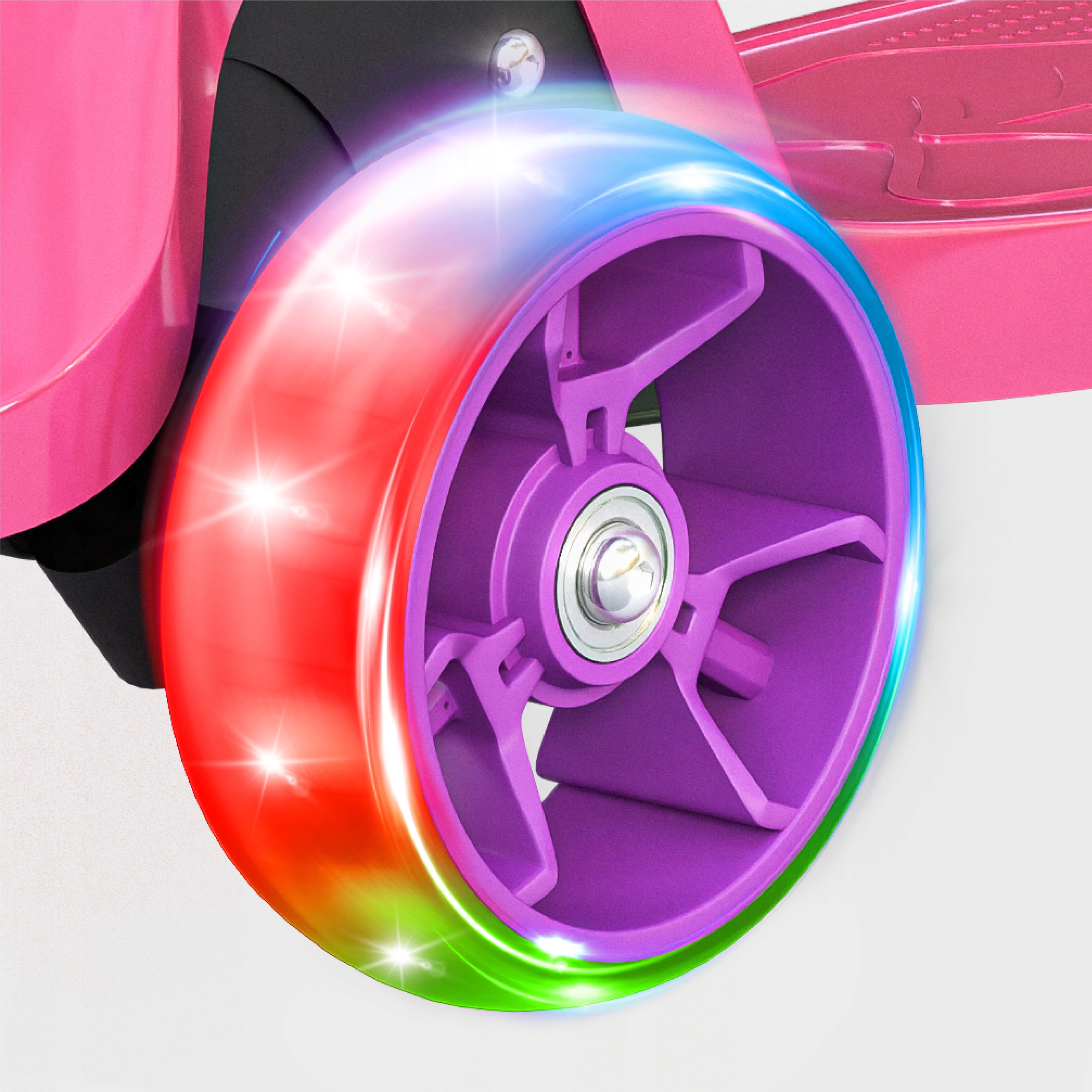 Скутер оснащено колесами з кольоровими світлодіодами, які активуються під час їзди, створюючи привабливий візуальний ефект і покращуючи видимість.