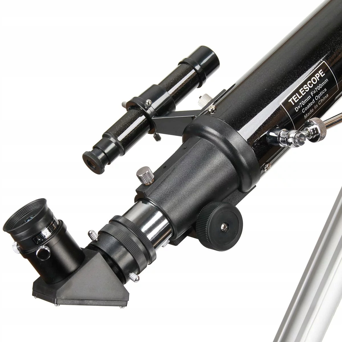 Телескоп Sky-Watcher (Synta) BK707AZ2 – це легкий астрономічний телескоп, призначений для астрономів-початківців, особливо дітей. Це простий у використанні рефрактор діаметром 70 мм, який дозволяє збільшити зображення до 140 разів. Обладнання важить лише кілька кілограмів, і його можуть легко переносити з місця на місце зовсім маленькі спостерігачі. На відміну від багатьох телескопів цієї цінової групи, SkyWatcher 705AZ2 вирізняється відносно непоганим оснащенням (окуляри Kellner замість більш дешевих Ramsdens і Huygens), а також досить якісним об'єктивом. Порівняно з подвійним телескопом SK705AZ2, оптична система Sky-Watcher 707AZ2 забезпечує дещо більші збільшення з інтенсивністю світла f/10. Об'єктив має діаметр 70 мм і фокусну відстань 700 мм. Він покритий досить хорошим антибліковим покриттям. Телескоп з таким об'єктивом дозволяє знаходити найяскравіші туманності за умови, що спостереження проводяться далеко від вогнів міста. Красиво виглядатимуть розсіяні скупчення (наприклад, Плеяди). Що ми побачимо в цей телескоп? Цей телескоп найкраще підходить для спостережень за Місяцем, а також для основних спостережень за тілами в Сонячній системі. Sky-Watcher 707AZ2, незважаючи на скромні розміри, чудово показує кільця Сатурна, форми планетарних дисків, а також основні деталі, такі як пояси в атмосфері Юпітера або полярні шапки Марса в періоди хорошої видимості червоної планети. Оснащений простим сонячним фільтром об’єктива, телескоп 707AZ2 стане чудовим інструментом для спостереження за Сонцем (у випадку з дітьми він повинен бути під наглядом дорослого). , 56x і 140x. Фокусування окуляра. Використовувався 1,25-дюймовий рейковий фокусер із кріпленням дзеркала під кутом 90 градусів. Телескоп має горизонтально перевернуте зображення (дзеркальне відображення), вертикальна орієнтація зберігається правильно. Фокусувальник і кришка сумісні з Більшість аксесуарів, що продаються. Збірка Телескоп підвішений на дуже легкій установці AZ2. З точки зору роботи, цей вузол нагадує фотографічний штатив. Додатково в набір входить 2-кратний об’єктив Барлоу. два верхніх збільшення 5x24 видошукач.