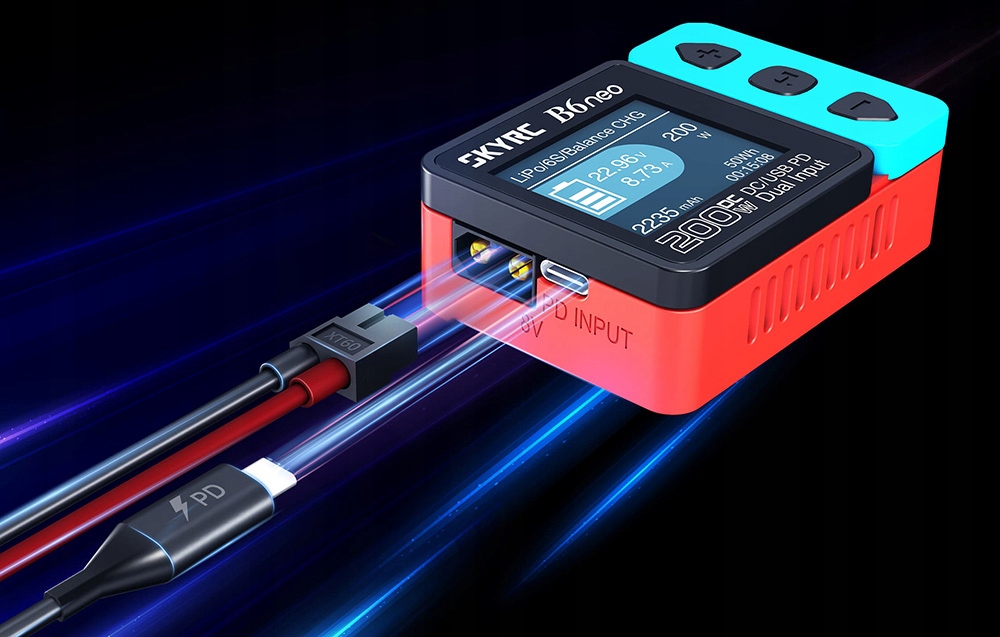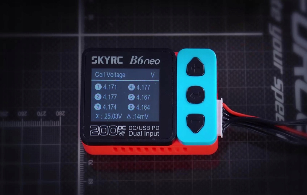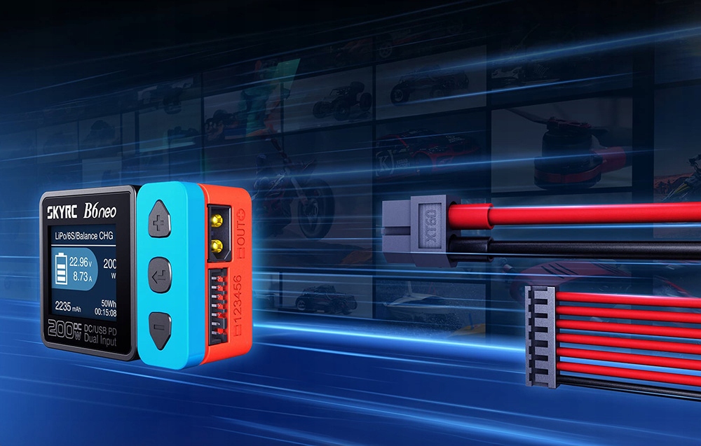 B6neo — це компактний зарядний пристрій із великою потужністю. Незважаючи на невеликі розміри, він здатний видавати до 200 Вт потужності під час зарядки, підключеної до джерела постійного струму. Крім того, він може діяти як цифрове джерело живлення, пропонуючи регульовану напругу від 5 до 27 В і силу струму від 1 до 10 А. Інтерфейс ColorX, вбудовані функції безпеки та просте оновлення прошивки завдяки спеціальному додатку Charger Master роблять B6neo зарядним пристроєм, адаптованим до сучасних потреб. Безпека, потужність і зручність використання - ось риси, які відрізняють продукт SkyRC.