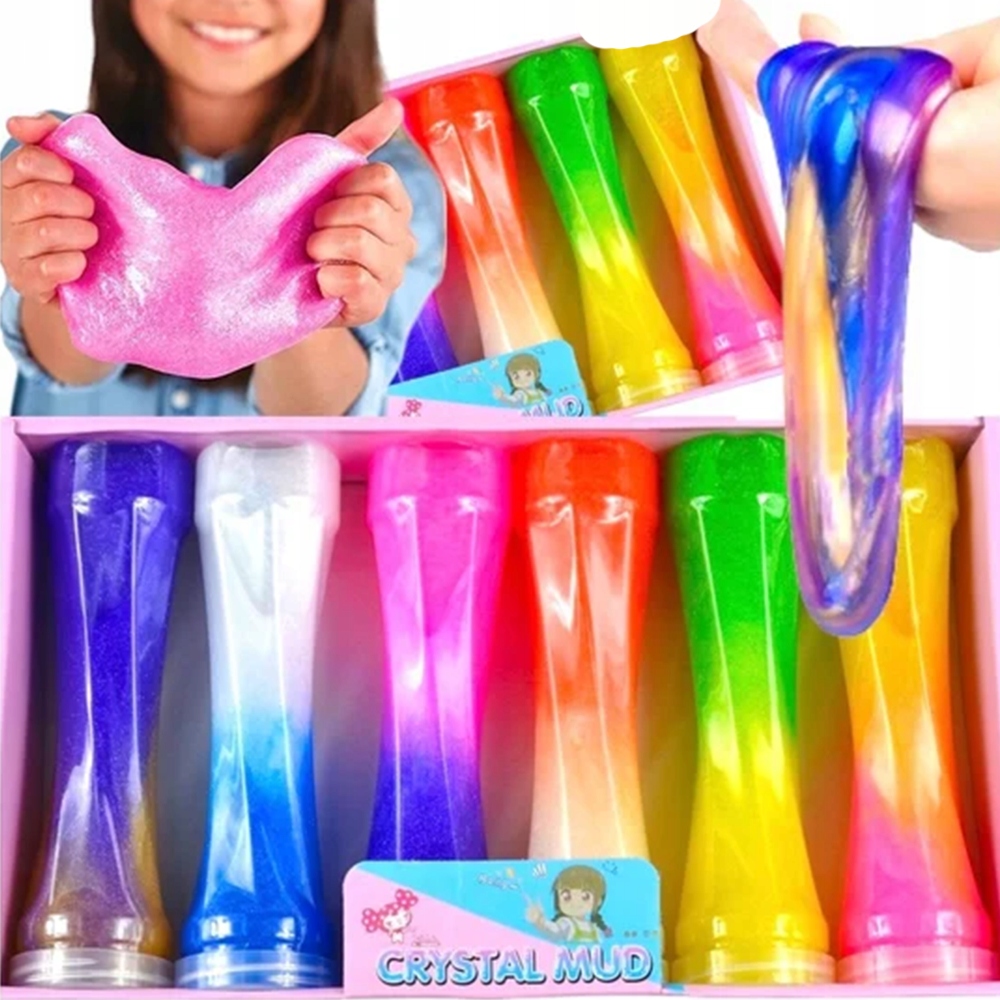 Набір із 6 слаймів інтенсивного кольору у високих тонких трубках. Кожен слайм має унікальний градієнтний ефект і блискучі частинки, які надають йому привабливого чарівного вигляду. Ідеально підходить для стискання, розтягування, розминання та сенсорної гри.
