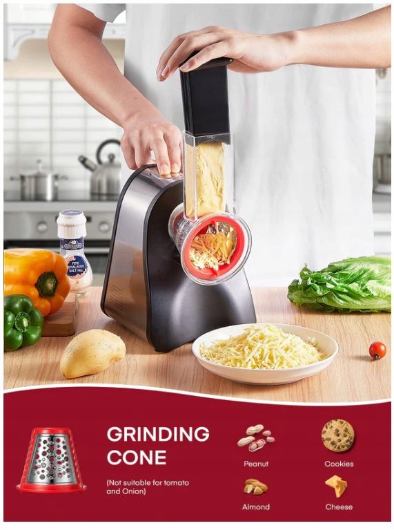 - Швидко. і легке нарізання/подрібнення: ця електрична терка призначена для легкого нарізання, подрібнення або нарізання фруктів, овочів або сиру. Ефективний двигун потужністю 200 Вт і вбудовані конічні гострі леза дозволяють готувати їжу за короткий час. Дайте вам більше часу, щоб насолоджуватися кожною їжею, без поспіху та високоякісним життям.