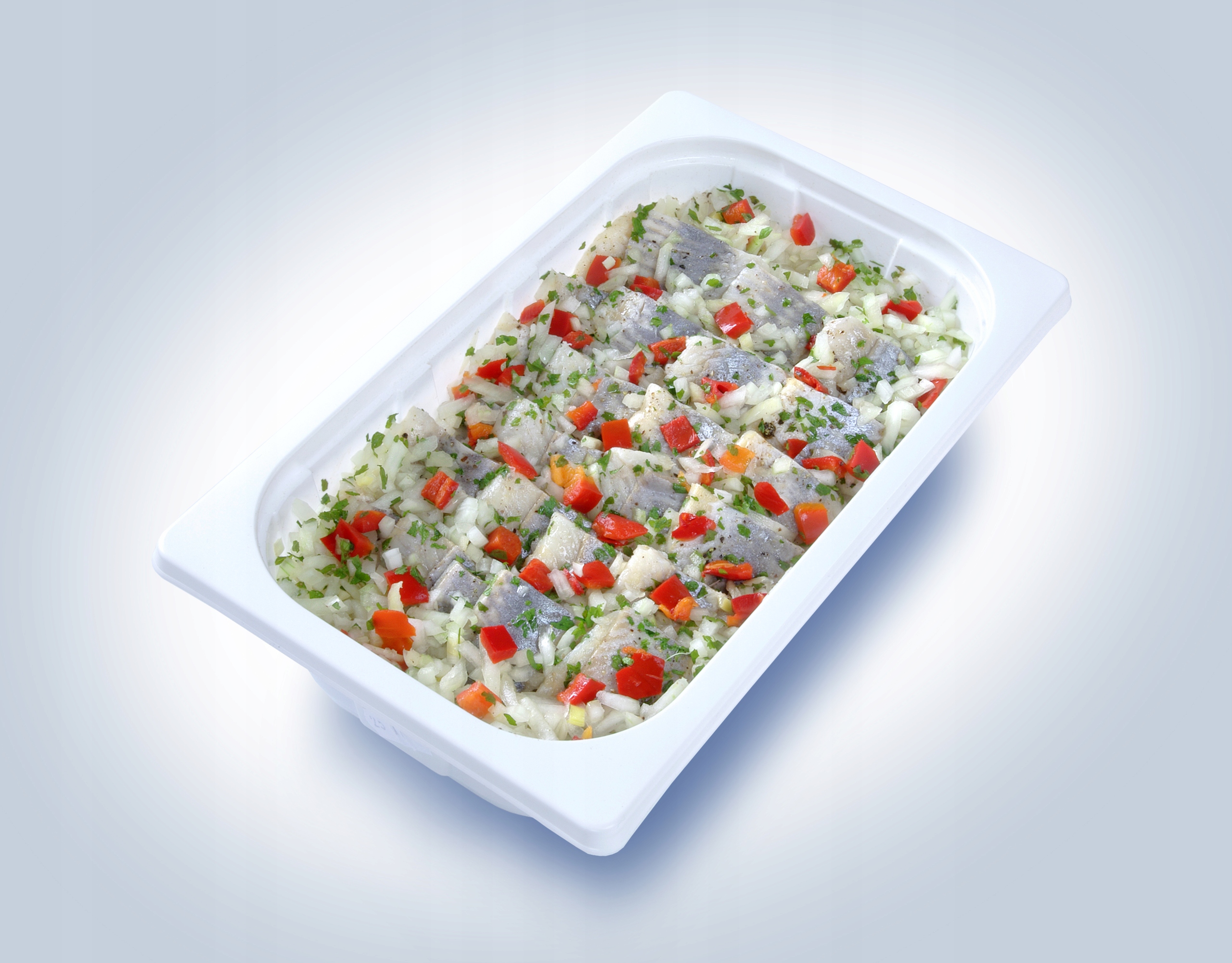 - Приготовані філе Атлантичного оселедця 75 %(солона оселедець без шкіри 99,5 %, повені: вода, сіль, регулятори кислотності: цитрат натрію, цитарна кислота, духовний оцет, ампліфікатор аромату: