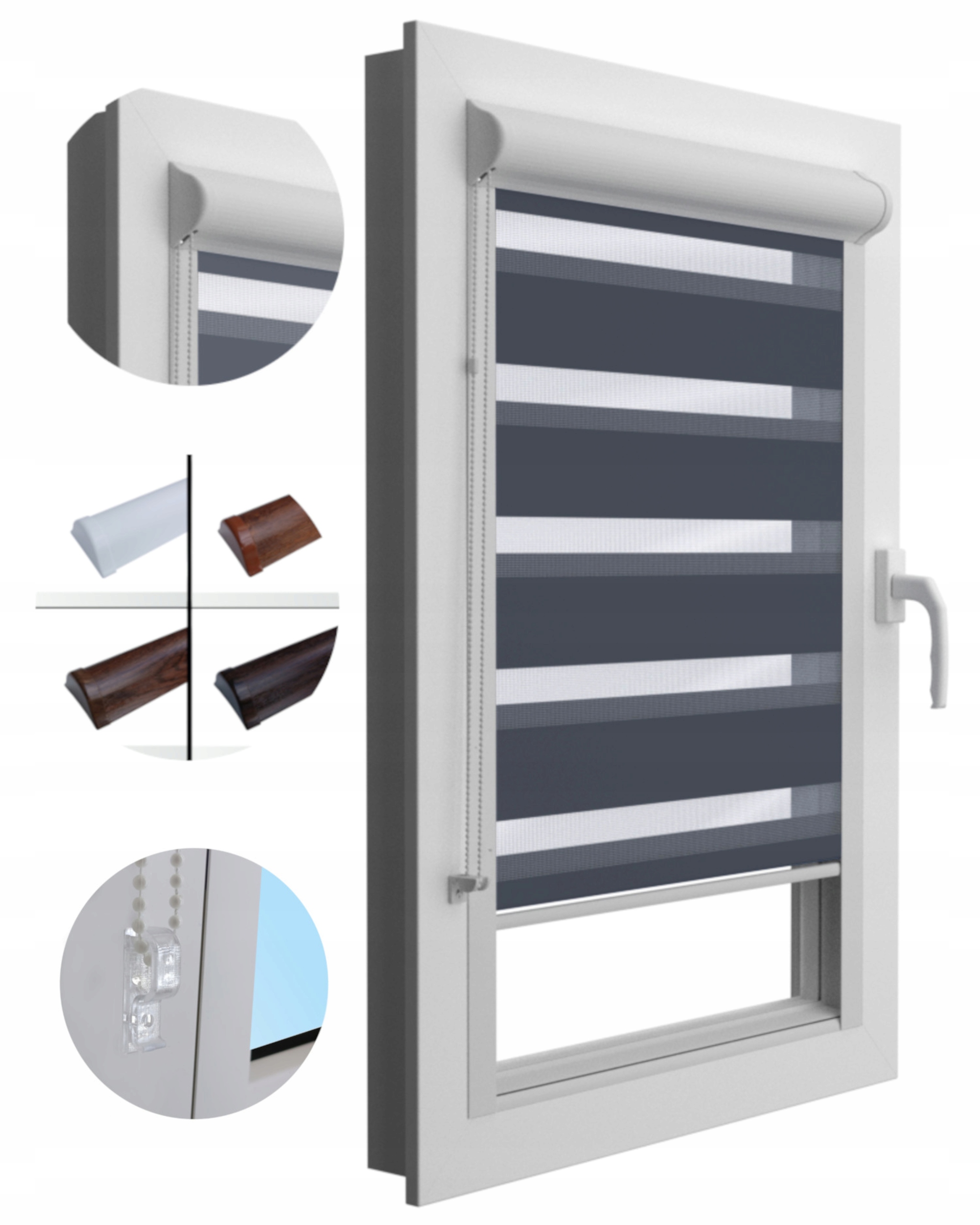 жалюзі день і ніч у класичній касеті -ці класичні кришки для вікон матеріалу, які відрізняються універсальним дизайном, який буде працювати в кожній кімнаті. Їх легко встановити, естетично зроблені та дуже функціональні. Сліпий складається з двох поперемінно розташованих ременів різних матеріалів - затемнюючої тканини та прозорої сітки. Їх нерівномірна та добре розроблена конструкція дозволяє керувати світлом, яке пропадає через вікно, переміщуючи їх відносно один одного. Касета, в якій сліпий розміщений ідеально інтегрується з вікном і є цілісним декоративним цілим.